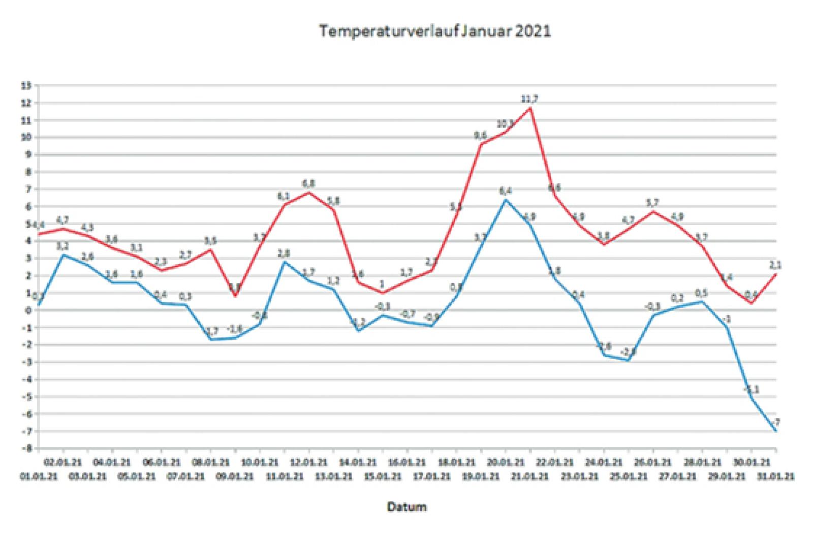 Der Januar 2021 ist vorbei und damit der zweite Wintermonat seit Anfang Dezember 2020. Der Januar startete sehr trüb, bis zum 7. Januar gab es nicht mal eine halbe Stunde Sonnenschein. Immer wieder kam es zu leichten Regenfällen bei Höchsttemperaturen ...