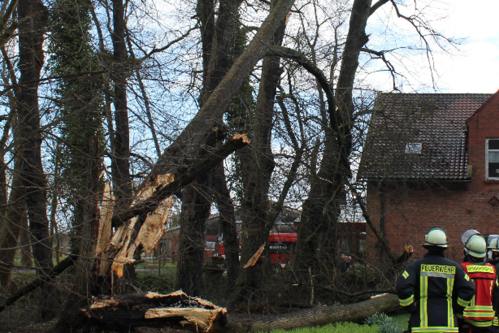 Der Baum war bereits abgebrochen und hatte sich in den danebenstehenden Bäumen verfangen und drohte unmittelbar auf ein Wohnhaus zu stürzen, teilte Joachim Rand von der Feuerwehr mit.