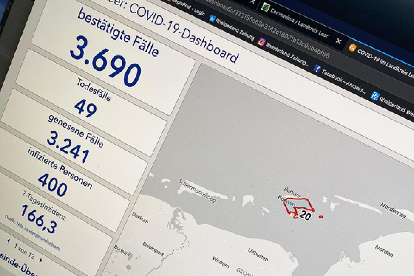 Die Zahlen im Kreis Leer bewegen sich weiter auf hohem Niveau: Heute wurden 57 Neuinfektionen gemeldet. Die Zahl der aktiven Fälle beläuft sich auf 400 - zwölf mehr als gestern. Die 7-Tagesinzidenz ist nunmehr auf 166,3 angestiegen (Vortag: 146,4). In Quarantäne befinden sich 928 Menschen.
