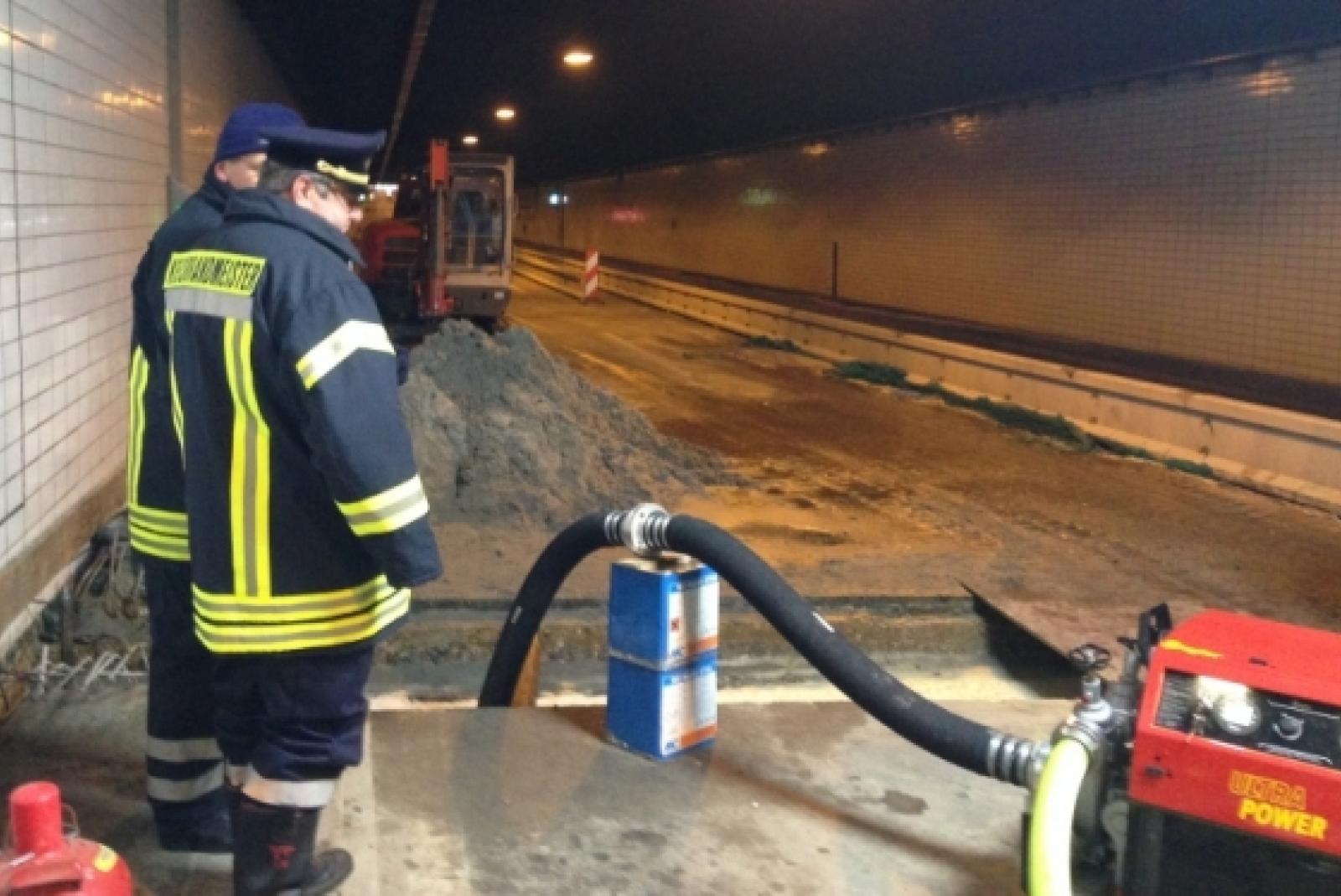 Das Leck in einer Tunnelfuge ist mittlerweile abgedichtet, die Ursachenforschung läuft weiter. Das Foto zeigt den Feuerwehreinsatz im Dezember, bei dem die freiwilligen Helfer über viele Tage das ausströmende Wasser abpumpten. © privat