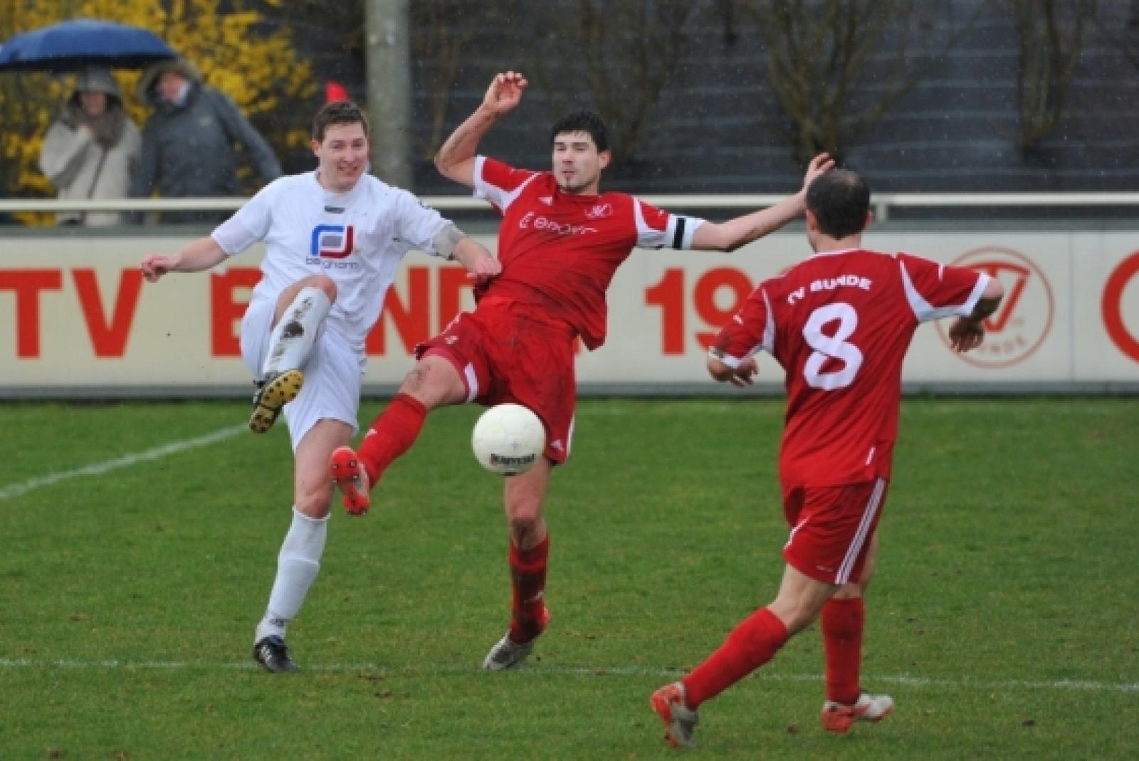 Regentanz: Auf dem rutschigen Rasen gegen Brake hatte die Bunder Elf um Tim Schouwer (Mitte) und Markus Winkler (rechts) zu kämpfen. © Foto: Bruins