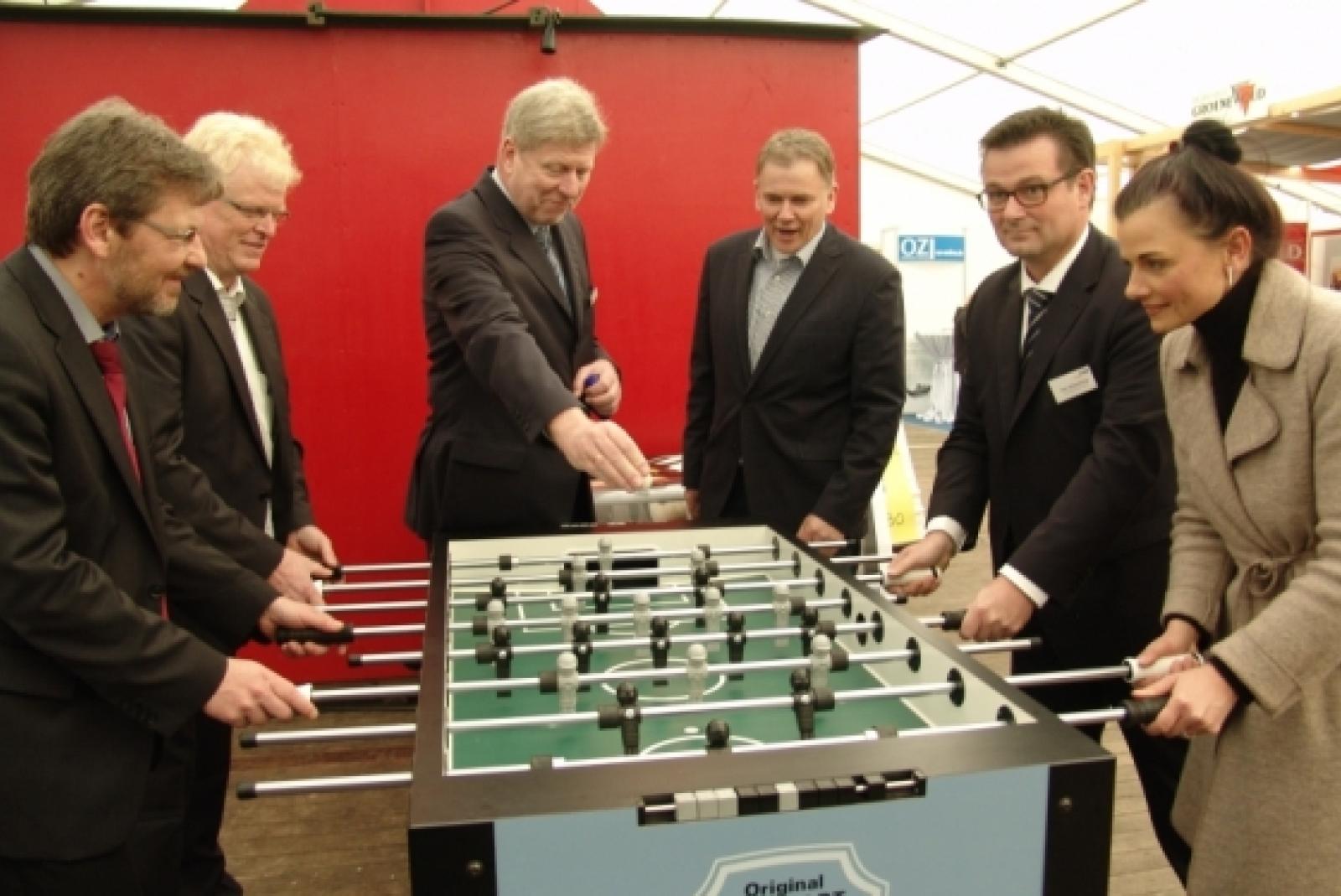 Keiner wollte am Kicker-Tisch verlieren (von links): Markus Paschke (SPD-Bundestagsabgeordneter), Dieter Gottwald (1. Vorsitzender Gewerbeverein Jemgum), Johann Tempel (Bürgermeister Jemgum), Gerald Sap (Bürgermeister Bunde), Ralf Riekenberg (EWE-Projektleiter) und Gitta Connemann (CDU-Bundestagsabgeordnete). © Boelmann