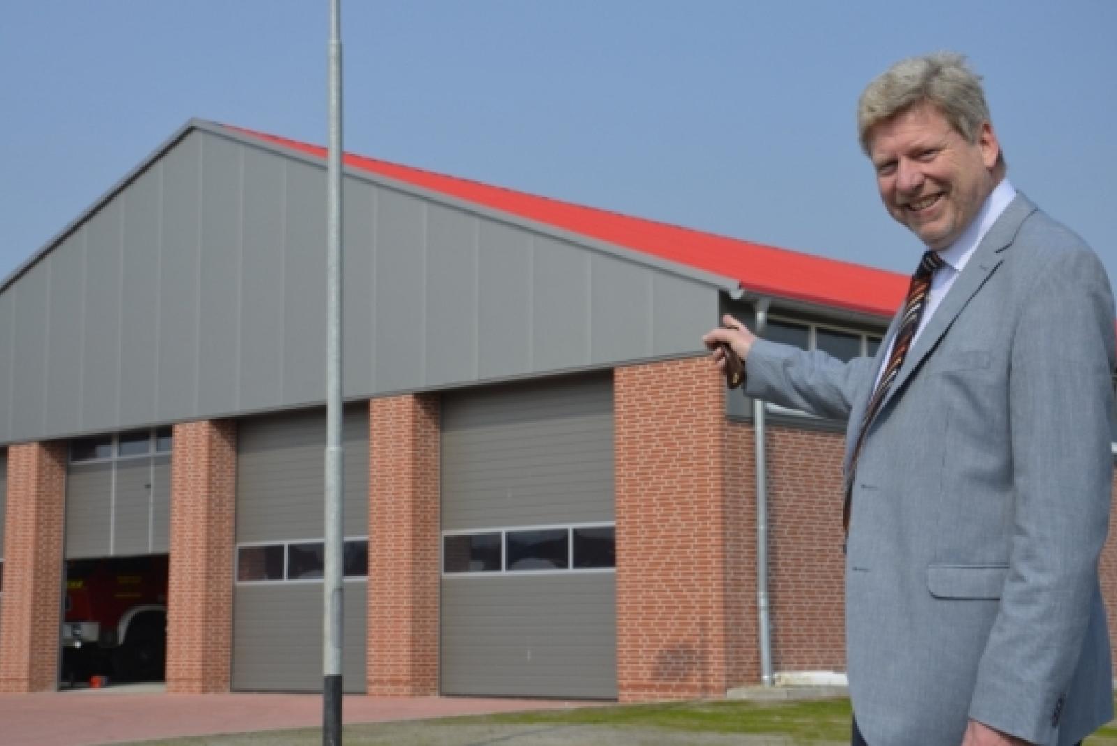 Stolz auf die Leistung der Jemgumer Feuerwehr ist Bürgermeister Johann Tempel. Der Neubau an der Hokelsumer Straße ist fertig, Restarbeiten stehen aus. So fehlt unter anderem das Feuerwehr-Emblem an der Fassade. © Foto: Wübbena