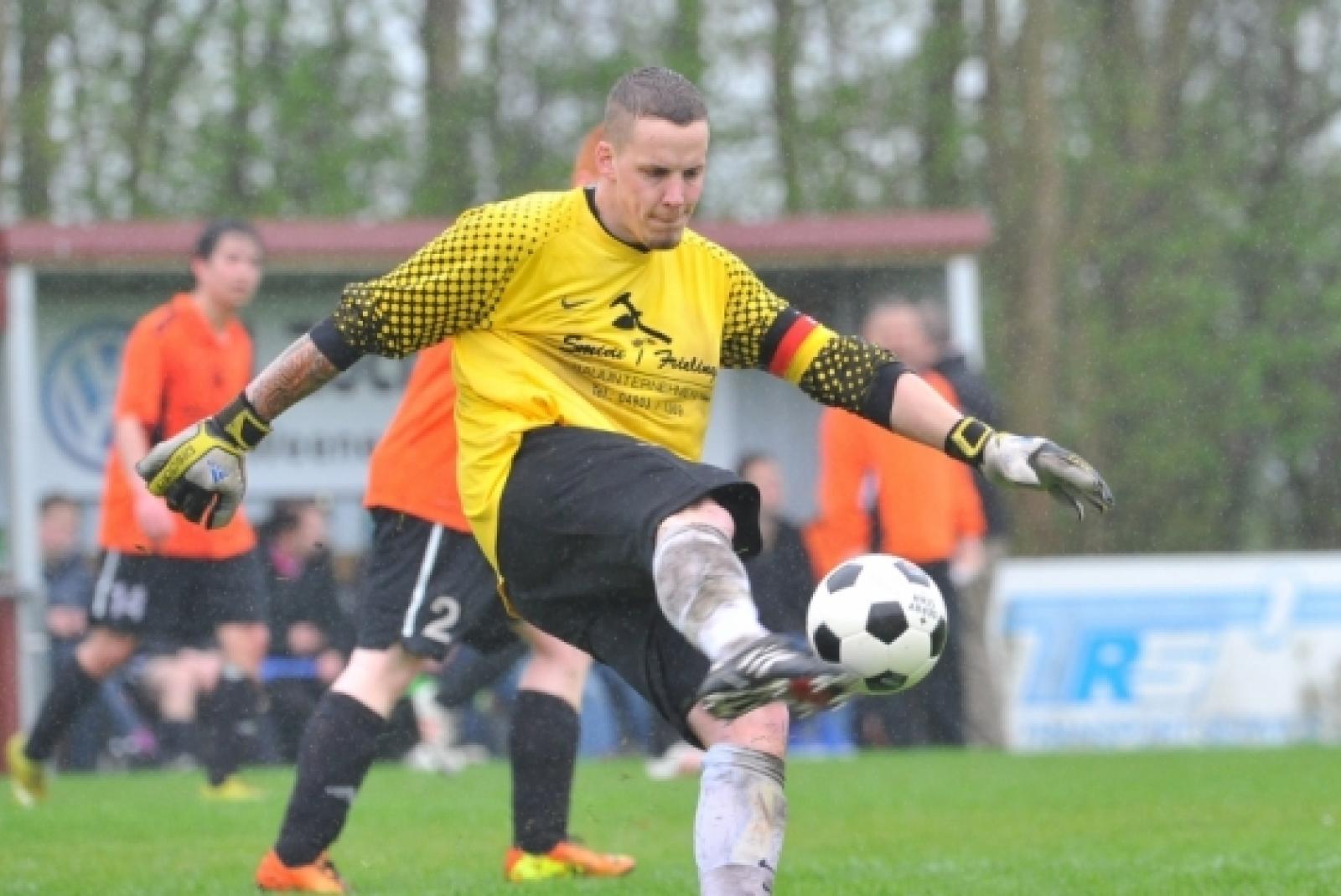 Abschlag im Regen: Wymeers Keeper Ingo Lüppens durfte sich endlich wieder über einen Sieg freuen. © Foto: Bruins