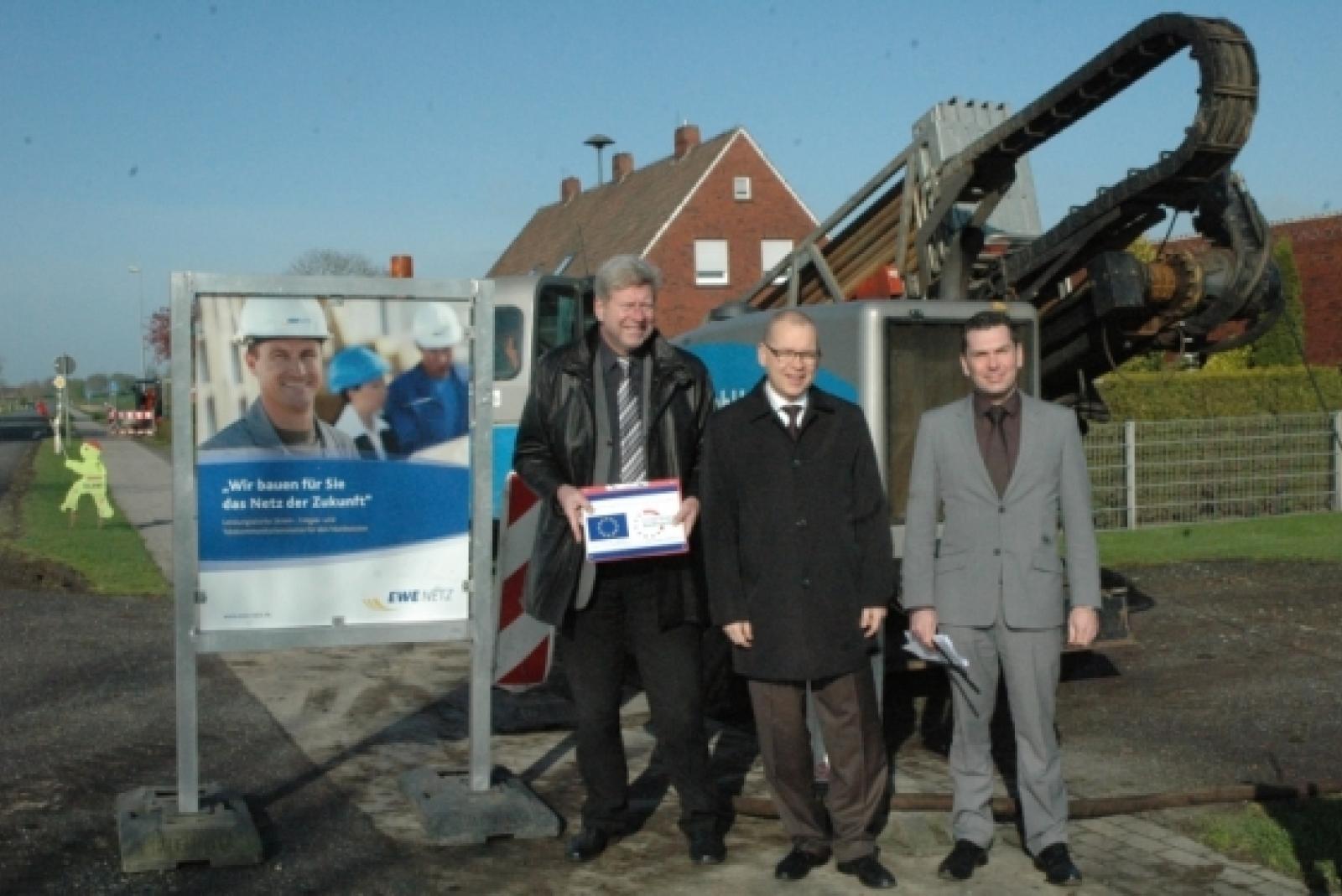 Der Anfang ist gemacht: Bürgermeister Johann Tempel mit den EWE-Vertretern Rainer Raddau und Gerrit Pruss (von links) an der Kreisstraße K 36 in Holtgaste, wo gestern im Horizontalbohrverfahren der Internet-Breitbandausbau begann. © Foto: Szyska