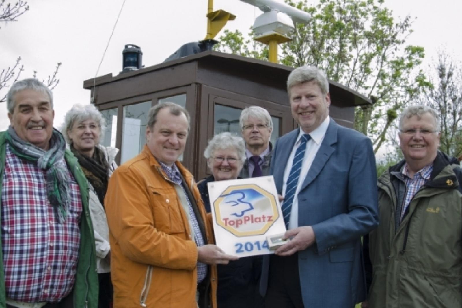 Eine Plakette für den Ditzumer Stellplatz überreichte Jürgen Dieckert (gelbe Jacke), Herausgeber des »TopPlatz«-Reiseführers, Bürgermeister Johann Tempel am Donnerstag. Erfreut über die Auszeichnung sind ebenfalls (von links) Manfred Klinkenborg (Wohnmobil-Stellplatzberater Landkreis Leer), Silke Gärtner (Tourist-Info Leiterin Detern), Annegret Bommelmann (1. Vorsitzende Verkehrsverein Ems-Dollart), Dieter Voß (Bürgermeister Jümme) und Luitpold Handwerker (Geschäftsführer VVED). © Foto: Wübbena