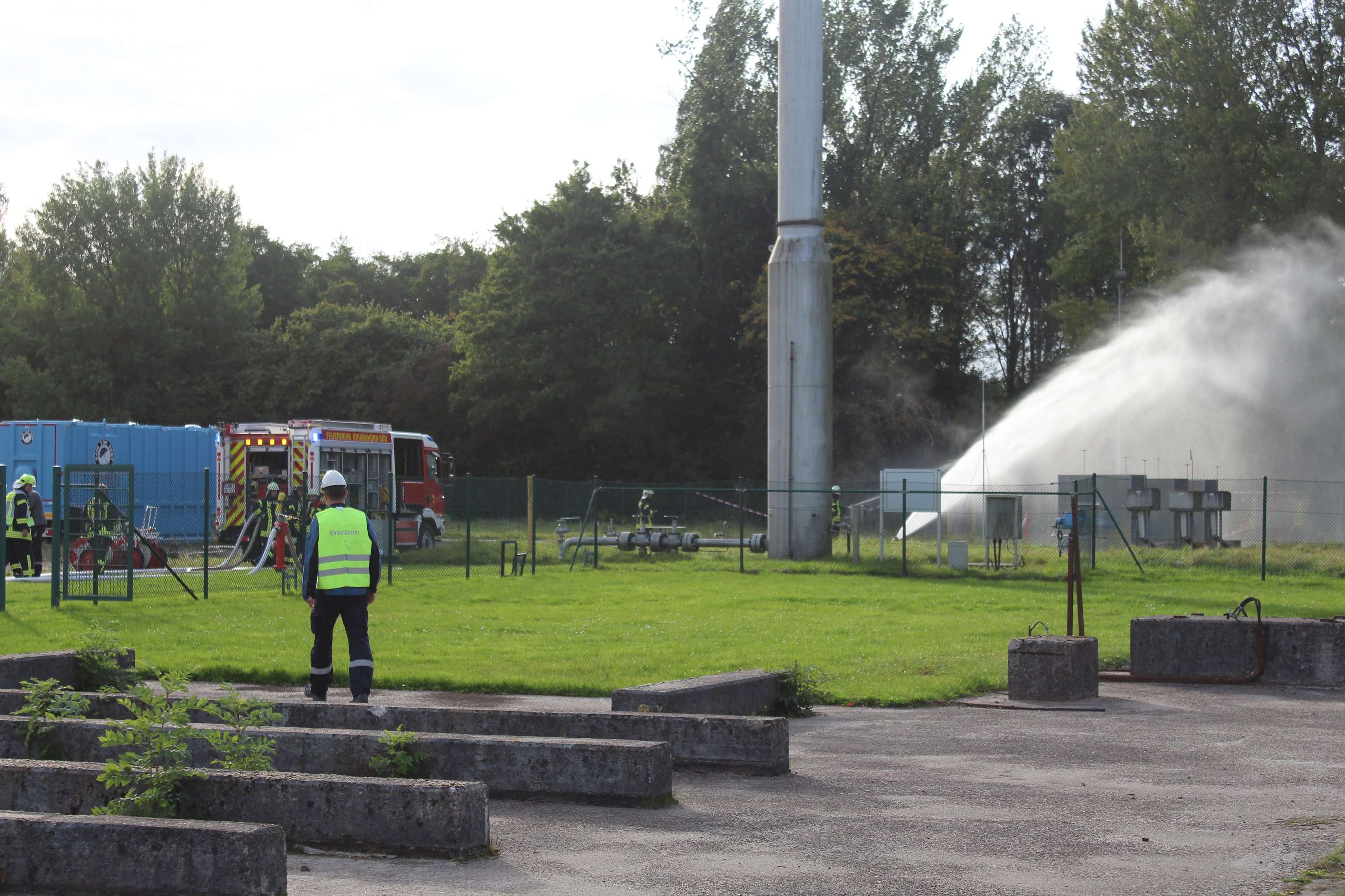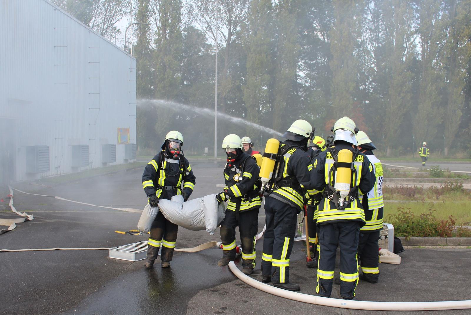 Eine Erkundung und Rücksprache mit dem Einsatzleiter des Betriebspersonals ergab, dass der Brand gemäß Übungsszenario auf eine Halle übergegriffen hatte. Ein „Verletzter“, dargestellt durch eine Übungspuppe, musste durch Einsatzkräfte der Feuerwehr in der Halle gesucht und gerettet werden.