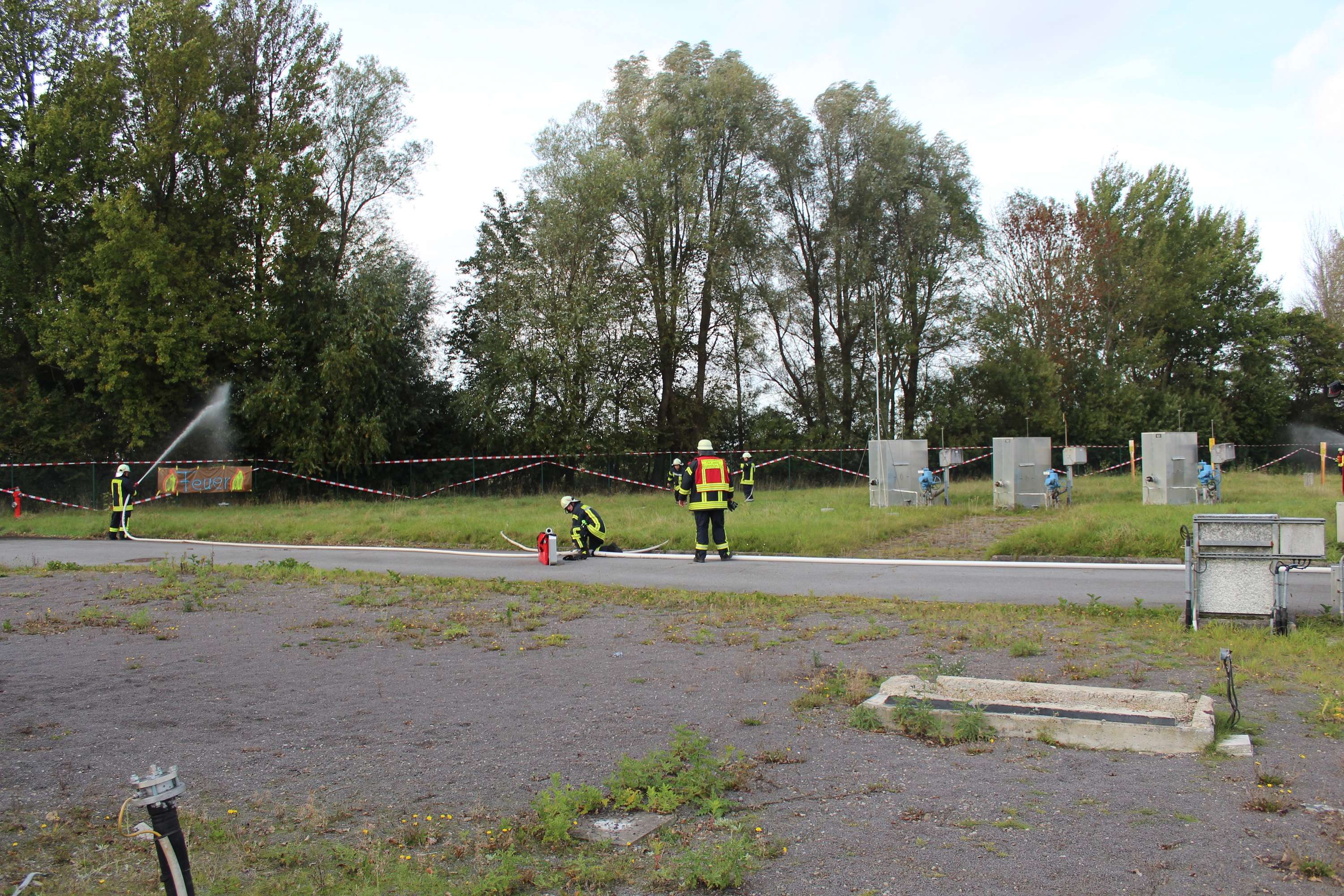 Die Einsatzkräfte der Feuerwehr trafen vor Ort ein geschlossenes Haupttor vor und mussten sich zunächst einen Zugang zum Betriebsgelände verschaffen. Von der Straße war bereits eine Rauchentwicklung aus dem Grüngürtel, simuliert durch eine Nebelmaschine, zu erkennen.