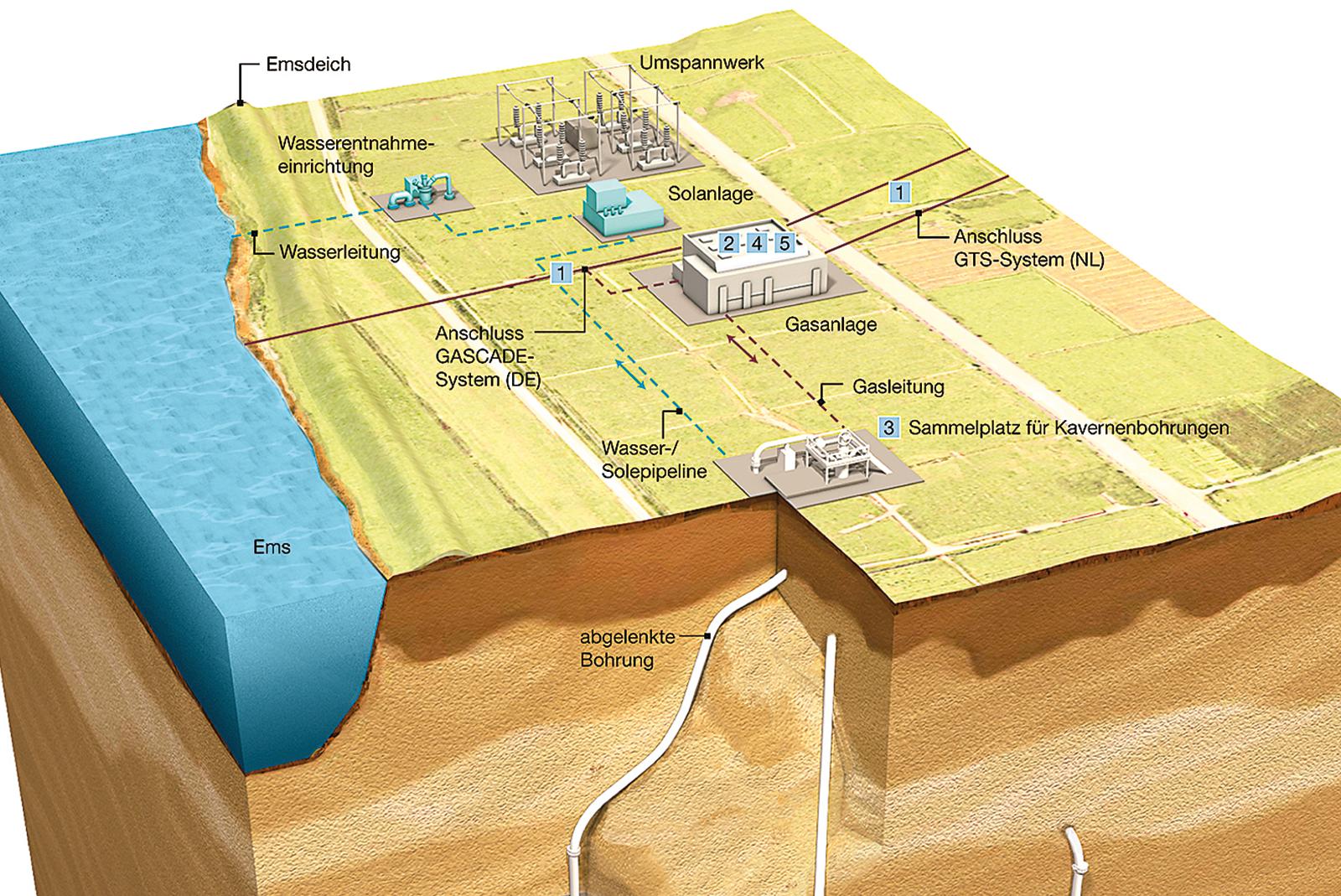 Die Astora GmbH betreibt in Jemgumkloster zurzeit zehn Kavernen, verfügt aber über die Genehmigung zur Aussolung von acht weiteren. Geplant ist das aktuell nicht. © Foto: Astora GmbH