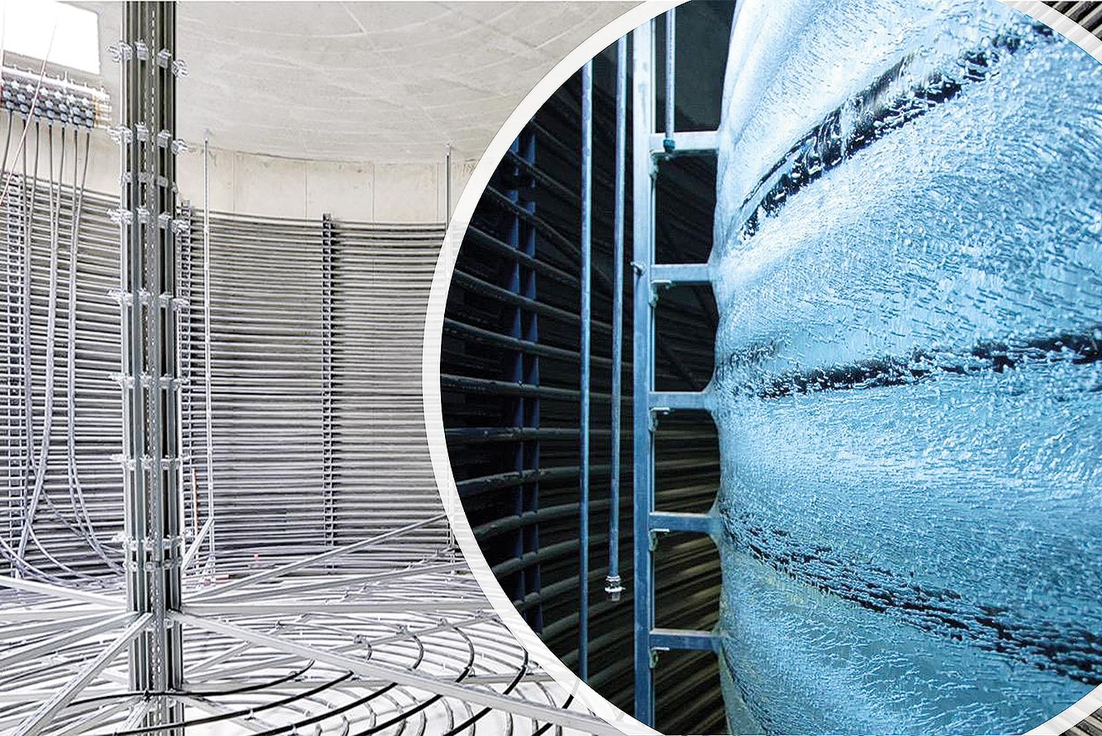 Im »Eisspeicher« befindet sich eine spiralförmig verlegte Leitung. Beim Gefrieren der darin enthaltenen Flüssigkeit wird Kristallisationsenergie frei, die durch Wärmepumpen zum Heizen der Wohnhäuser genutzt werden kann. © Foto: Viessmann Climate Solutions