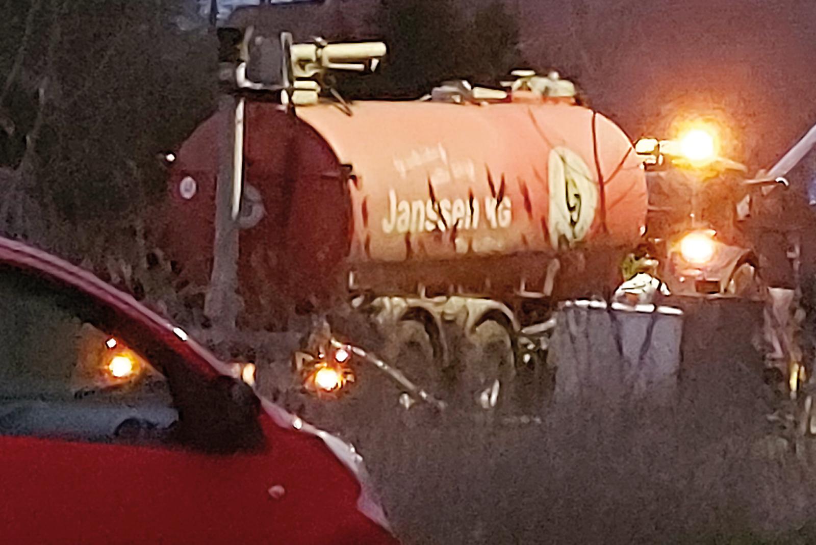 Die Gerüchteküche im Dorf brodelt, weil auf der Pogumer Straße in Höhe der Einmündung zur Straße »Auf dem Kee« mehrfach im Morgengrauen ein Traktor des Lohnunternehmens Janssen aus Rhede zu sehen war, der Fahrer einen Schachtdeckel öffnete und den Inhalt aus einem Güllefass in die Kanalisation abpumpte. © Foto: privat