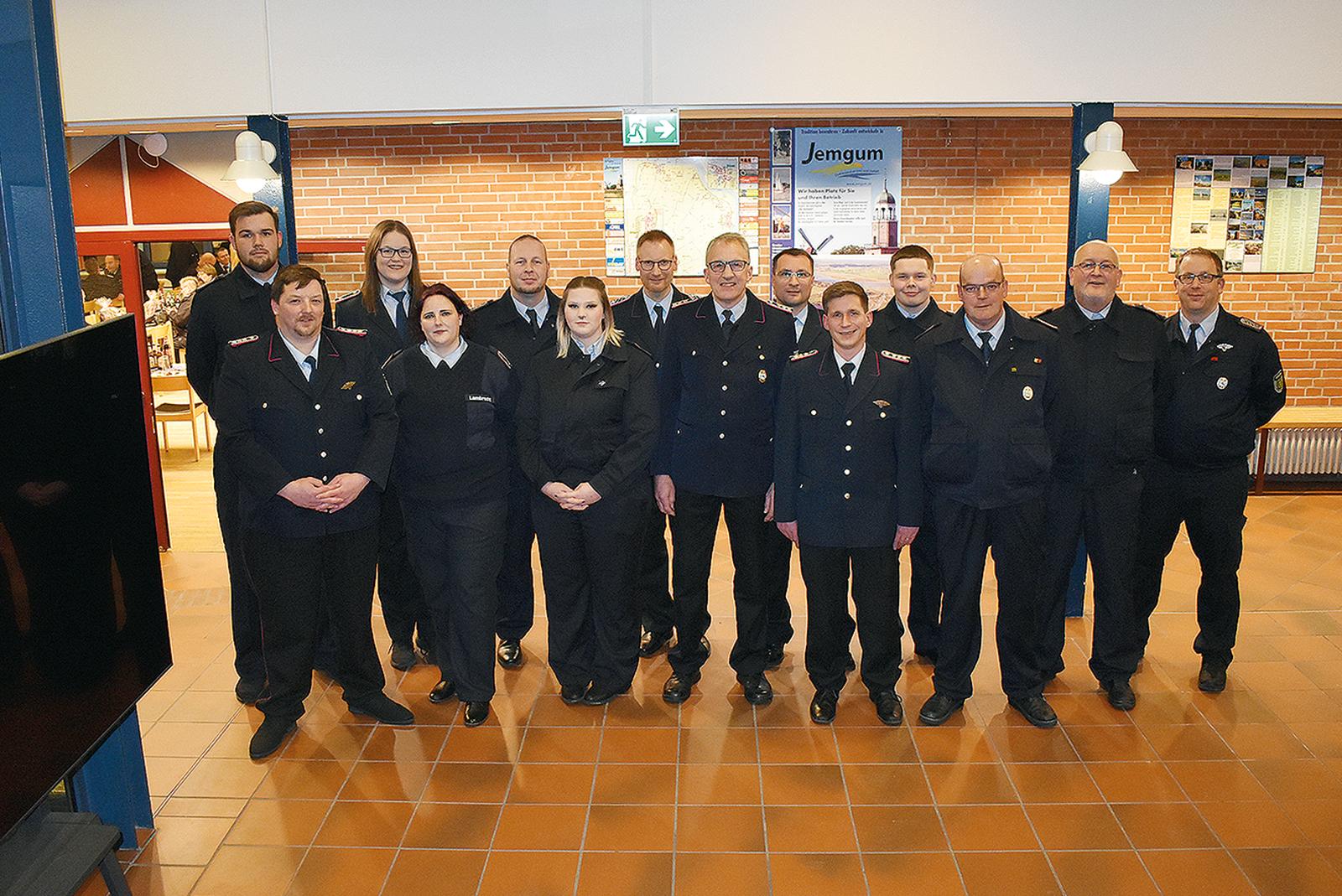 Das neue Ortskommando mit vorne von links): Florian Stahlhut (Schriftführer), Sandra Lambrecht (Leiterin Jugendfeuerwehr), Julia Olthoff (Leiterin Kinderfeuerwehr), Fritz Gent und Jörg Rösing (Beisitzer) sowie Gerhard Lüdemann (Gerätewart), daneben Ortsbrandmeister Ralph Janssen und sein Stellvertreter Ralf Broß. In der zweiten Reihe von links: Tammo Smidt (Zeugwart), Vanessa Smidt (stellvertretende Leiterin Jugendfeuerwehr), Michael Dannen (Atemschutzgerätewart), Andree Dannen (Sicherheitsbeauftragter), Jörg Padeken (Kassenwart) und Jannik Dannen (Kassenprüfer).  © Fotos: Kuper