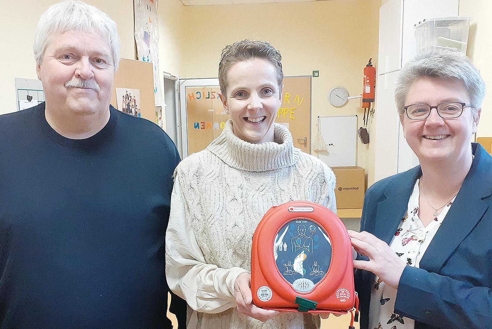 Joachim Bugiel und Stefanie Oltmanns-Heynen (Mitte) freuen sich über den neuen Defibrillator der Kita Midlum. Die Sparkasse LeerWittmund, vertreten durch Nicole Zimmer, übernahm die Kosten für die Geräte in Ditzum und Midlum.  © Foto: Berents