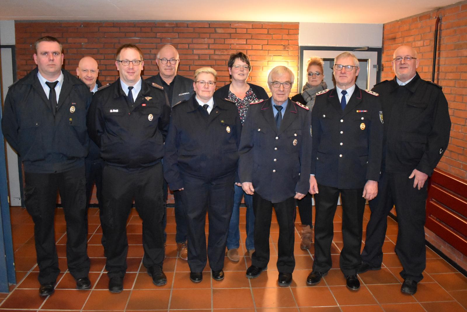 Im Bild von links: Gemeindebrandmeister Jan Remmers, Stephan Hilbrands (Stellvertreter), Ralf Broß (25 Jahre Mitglied), Bürgermeister Hans-Peter Heikens, Antje Lüdemann (40 Jahre Mitglied), Margitta Brandt (Ausschuss für Feuerschutz, Vereine und Verkehr), Günther Witt (40 Jahre Mitglied), Christiane Dorenbos (Fachbereichsleiterin), Werner Heikens (Altersabteilung) und Ortsbrandmeister Ralph Janssen.  © Foto: Kuper