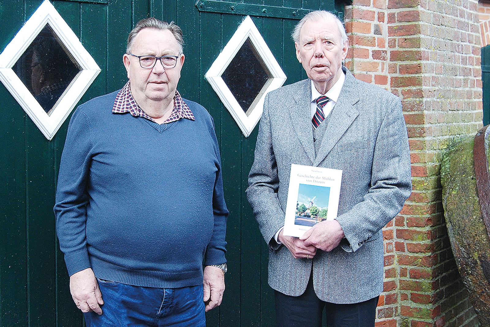 Vor der Eingangstür der Ditzumer Mühle: David Steen stellte gestern sein aktuelles Buch vor, das sich nur um den Gallerieholländer dreht. Links im Bild der ehrenamtliche Müller Hermann Oltmanns.  © Foto: Hoegen