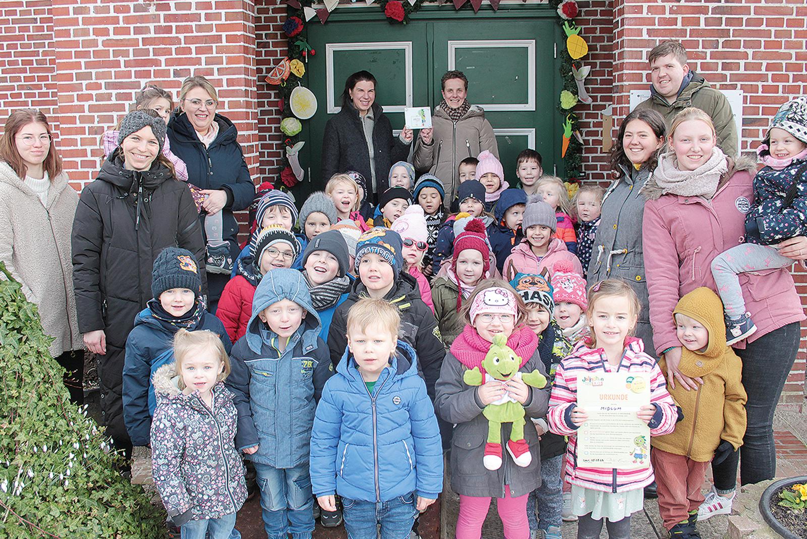 Die Mädchen und Jungen der Kindertagesstätte in Midlum bekamen am Donnerstag das Zertifikat über eine erfolgreiche Teilnahme am AOK-Programm »JolinchenKids« überreicht. Teilgenommen haben auch die Krippe in Midlum, die Außenstelle der Kita in Jemgum und die Krippe in Jemgum. © Foto: Busemann