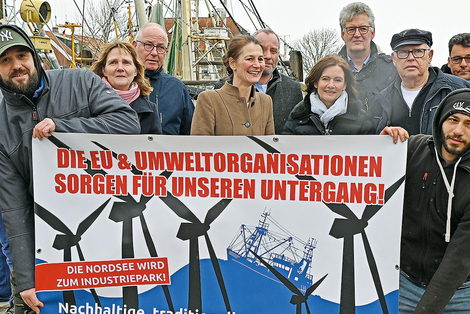 Schwarze Kreuze und Protestbanner: Dutzende Fischer haben am Donnerstag in Neuharlingersiel ihrem Unmut über das geplante Verbot der Grundschleppnetz-Fischerei Luft gemacht. Auch aus Ditzum waren Vertreter und Mitarbeiter der Betriebe gekommen. Die Niedersächsische Landwirtschaftsministerin Miriam Staudte (Gr&...