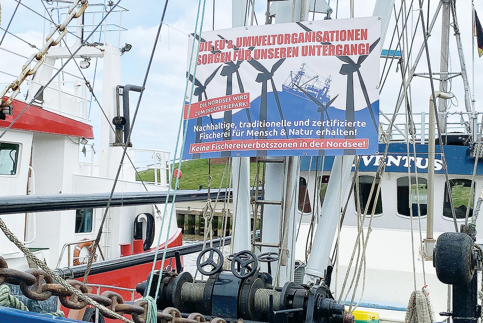 Protestbanner an einem Ditzumer Kutter: Die Fischer fordern von der EU ein Abrücken von etwaigen Verbotsplänen.