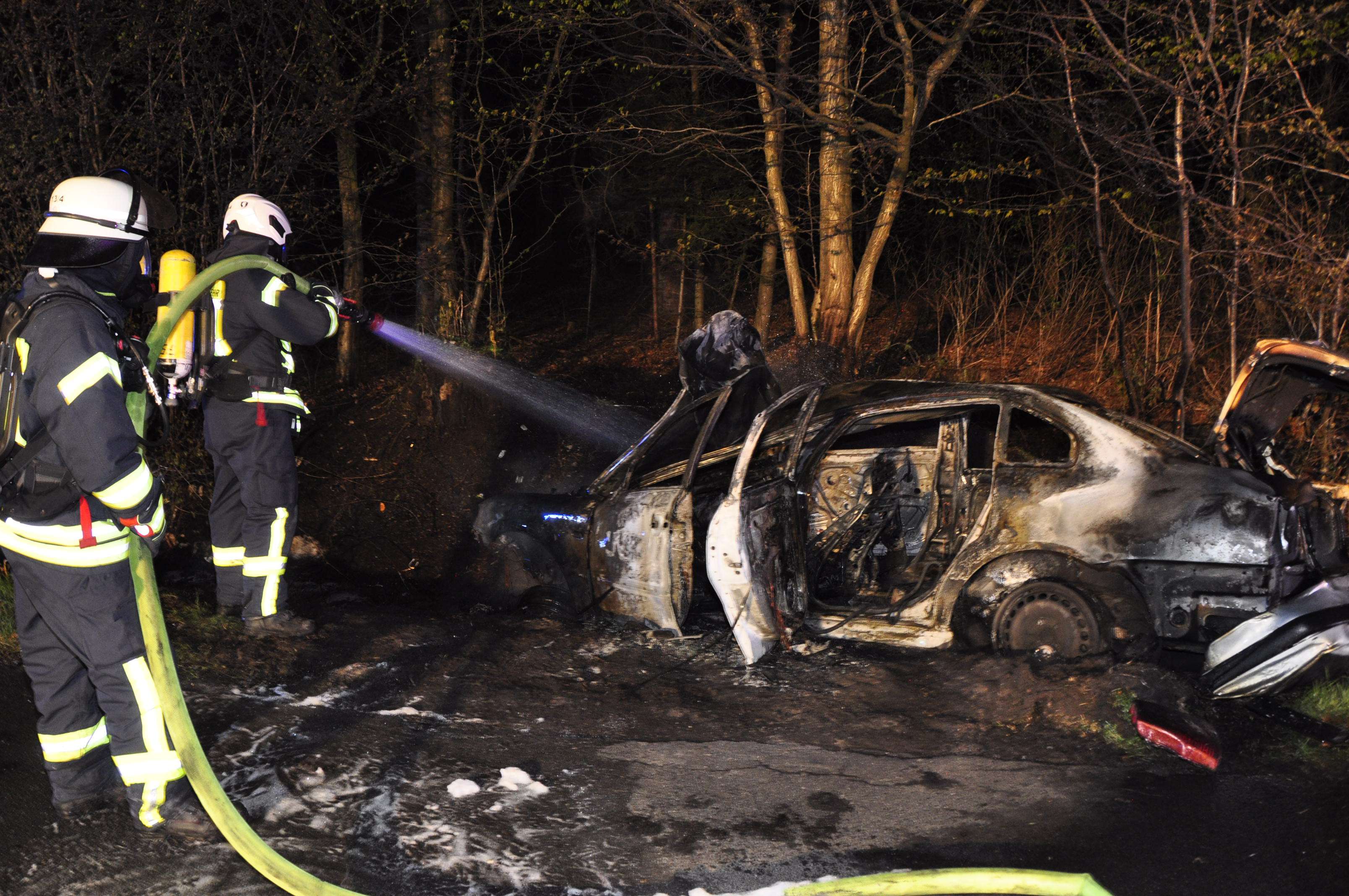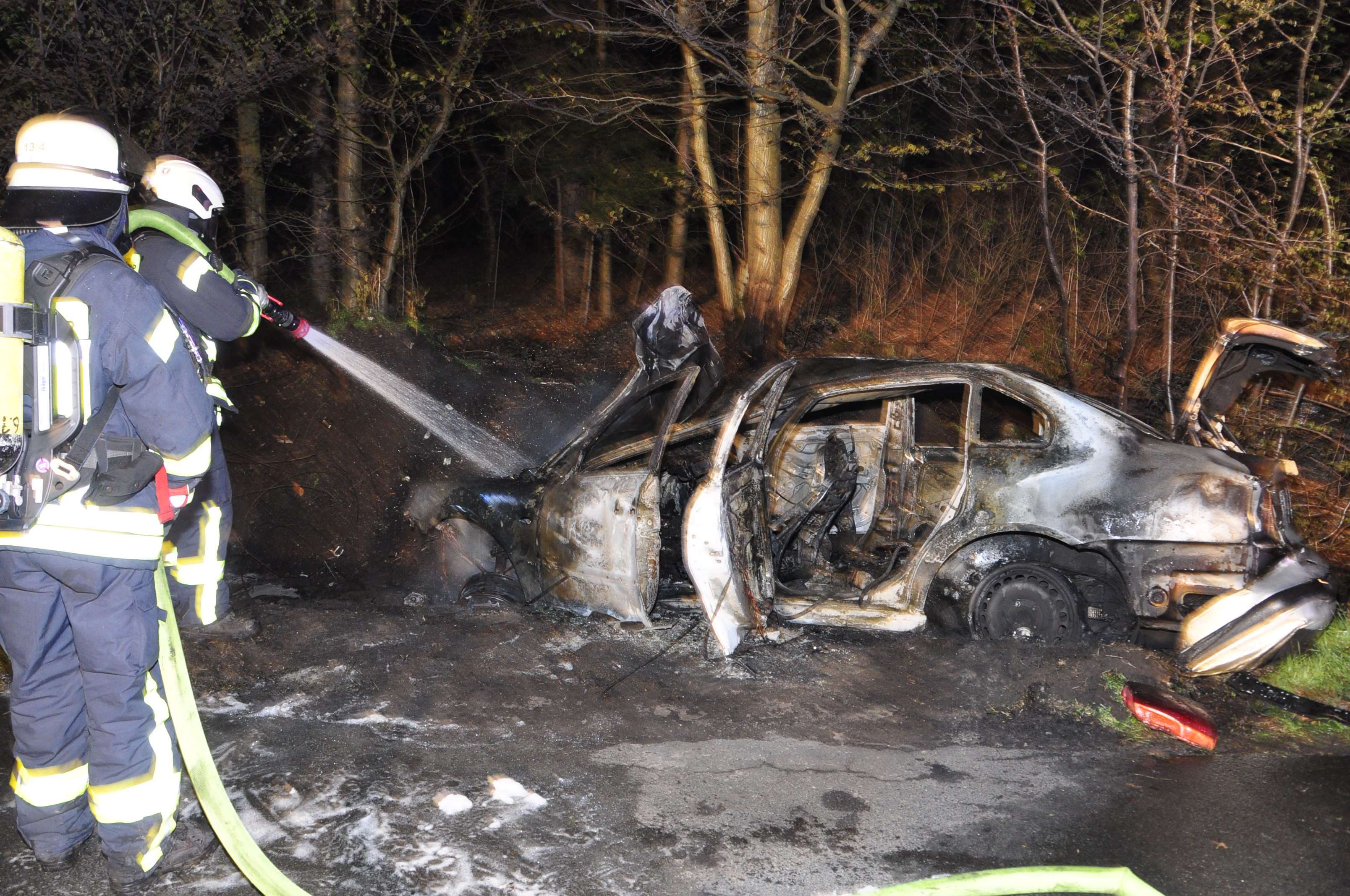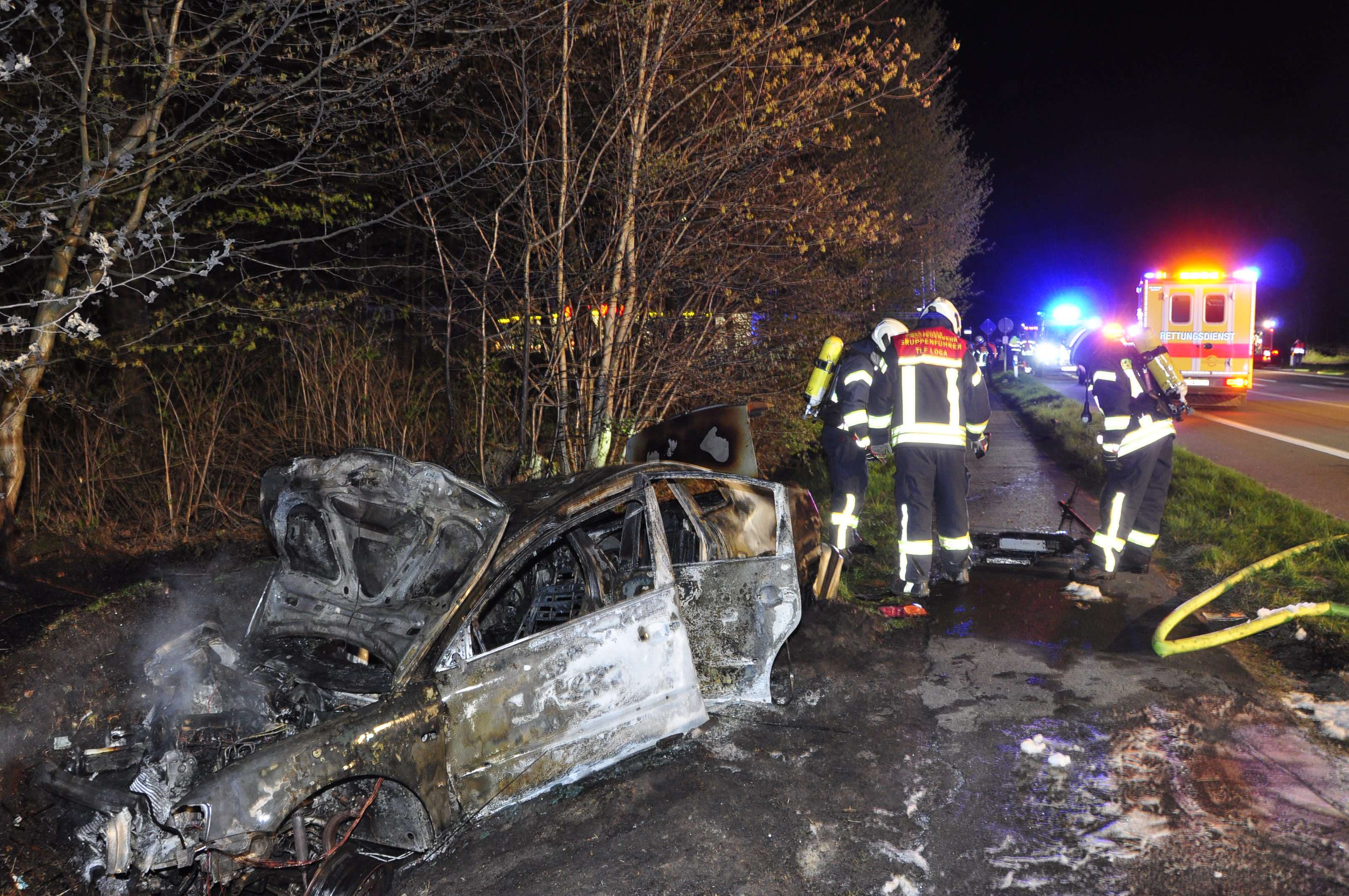 Durch die Feuerwehr Loga wurde der brennende PKW, sowie brennende Bäume und Waldboden abgelöscht. Zudem wurde auslaufender Treibstoff vor einer weiteren Ausbreitung gestoppt.
