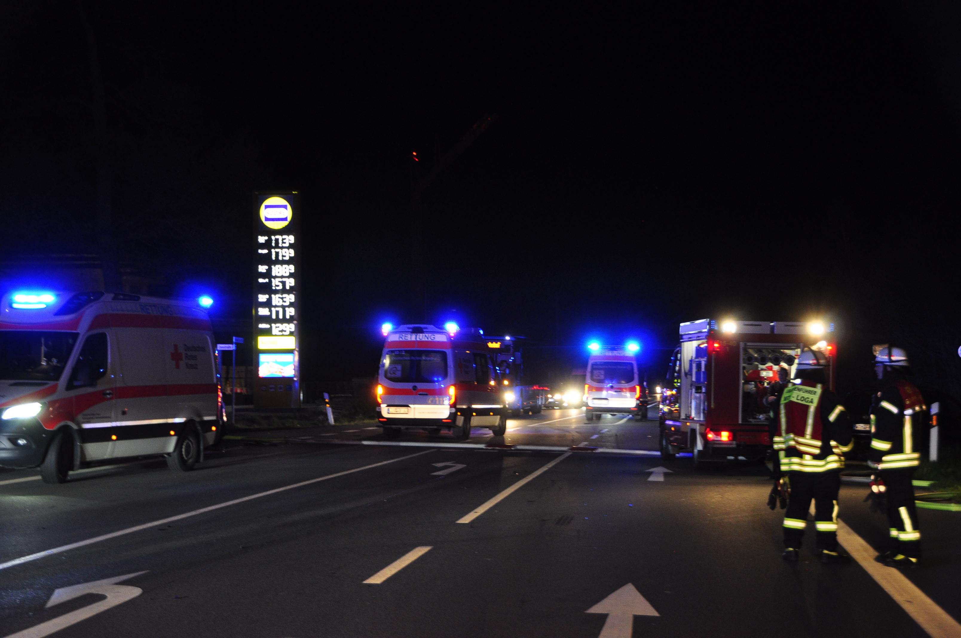 Feuerwehr, Rettungsdienst und Polizei waren nach nur wenigen Minuten mit diversen Fahrzeugen und Einsatzkräften vor Ort, um die Verunglückten zu versorgen und das brennende Fahrzeug zu löschen. Aufgrund der hohen Anzahl an Verletzten wurde zunächst ein MANV Alarm (Massenanfall von Verletzten) ausgelöst. Dadurch sind neben weiteren Rettungswagen auch der leitende Notarzt sowie koordinierende Kräfte des Rettungsdienst alarmiert worden.