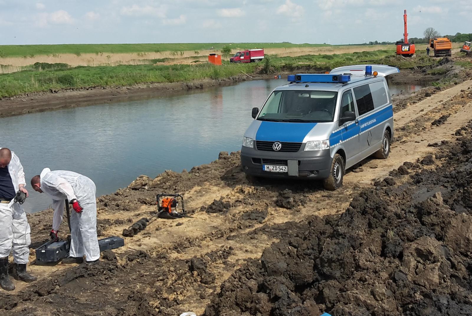 Dass sich im Ditzumer Bereich noch Kampfmittel aus dem Zweiten Weltkrieg befinden, zeigte sich unter anderem im Mai 2017 beim Bau des Landschaftssees, als Experten zwei Granaten bergen mussten. © Mohr (Kampfmittelbeseitigungsdienst)