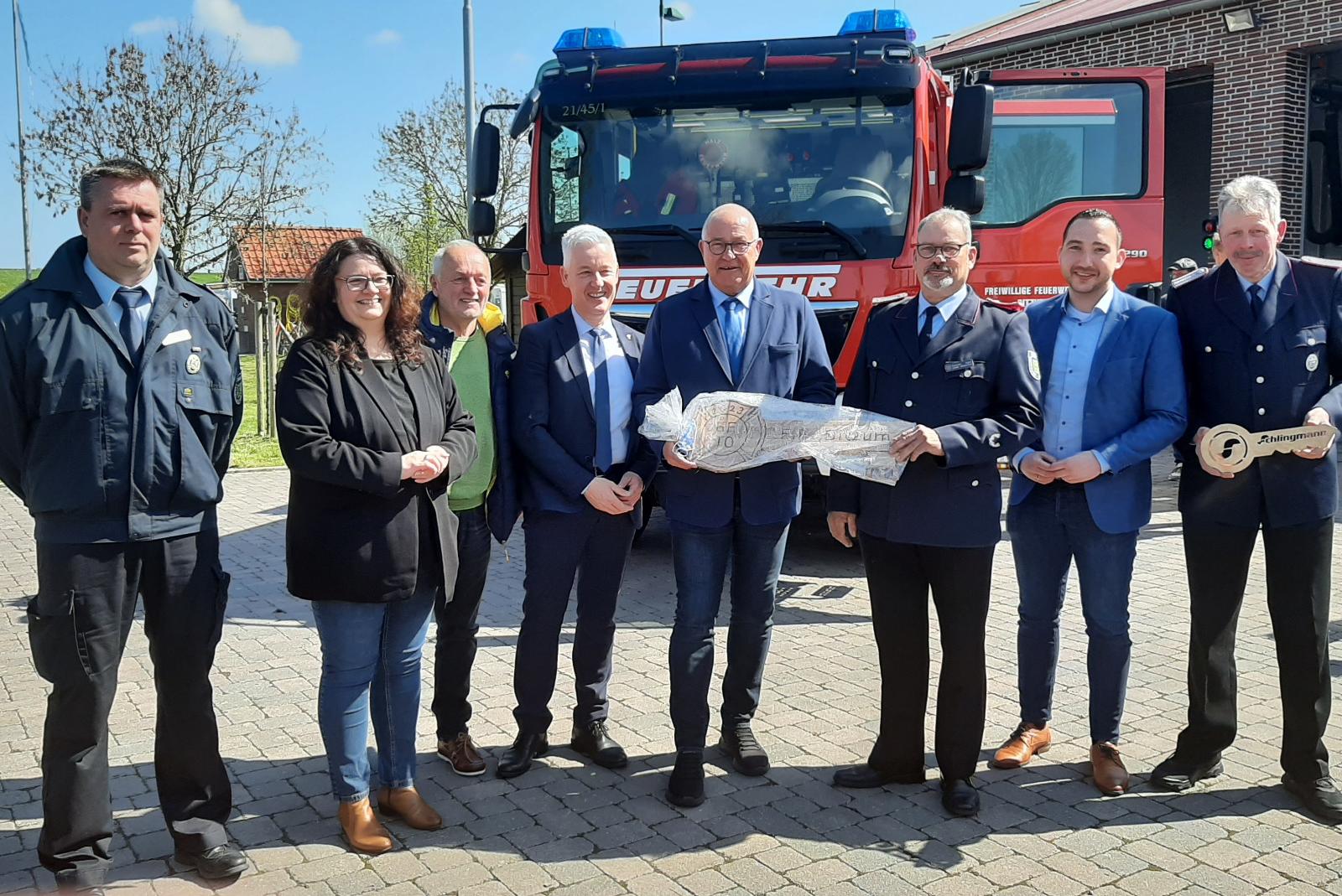 Symbolische Schlüsselübergabe für das neue Feuerwehrheim: (von links) Gemeindebrandmeister Jan Remmers, MdB Anja Troff-Schaffarzyk, Ortsvorsteher Konrad Kruse, Landrat Matthias Groote, Bürgermeister Hans-Peter Heikens, Ortsbrandmeister Wilhelm Pruin, MdL Nico Bloem sowie der stellvertretende Ortsbrandmeister Gerold Voget. © Dorenbos/Gemeinde Jemgum