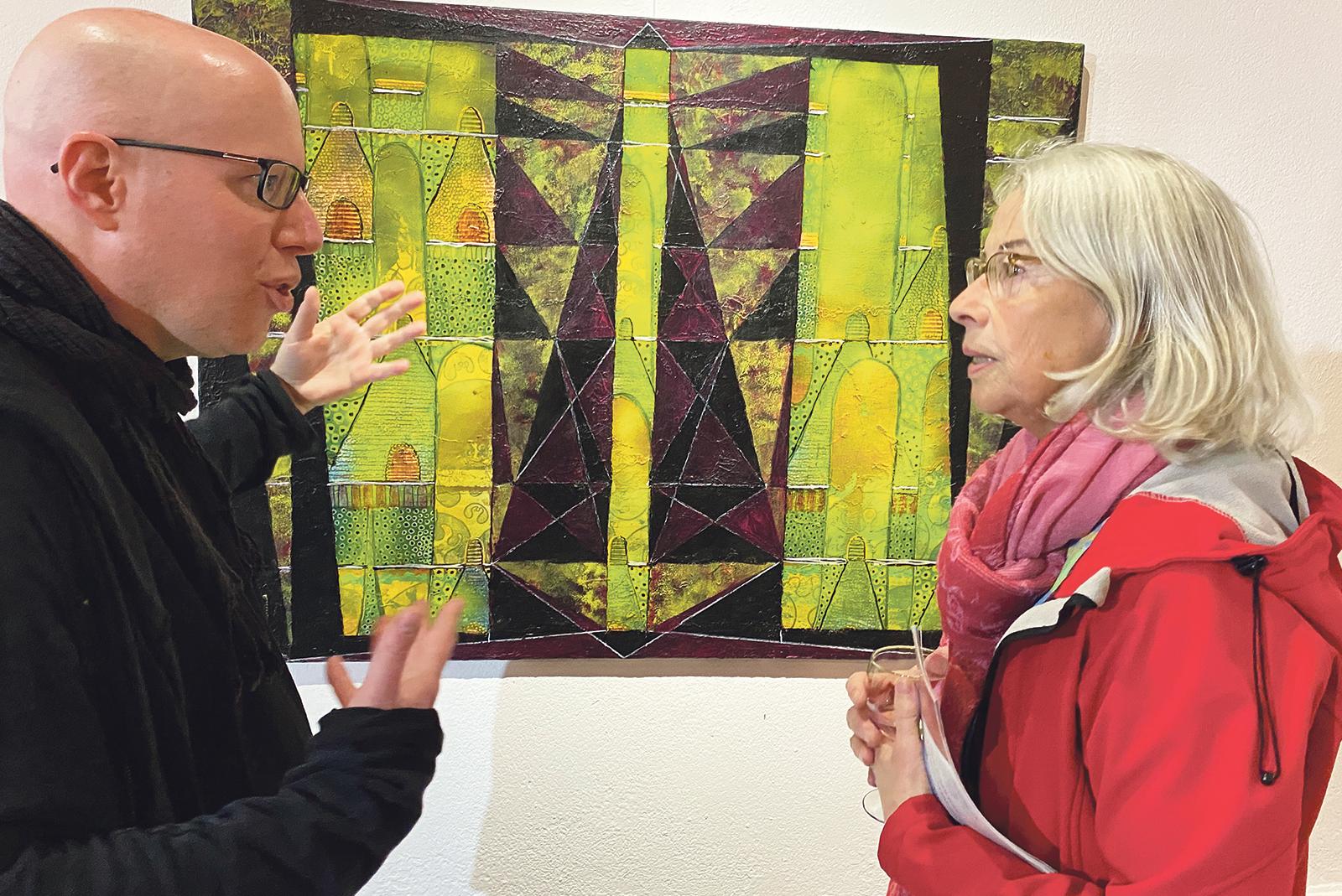Jürko Voßgröne, aufgewachsen in Bunde, fachsimpelt mit Anke Rietdijk aus Jemgum über sein Bild »The City 01«. © Kuper