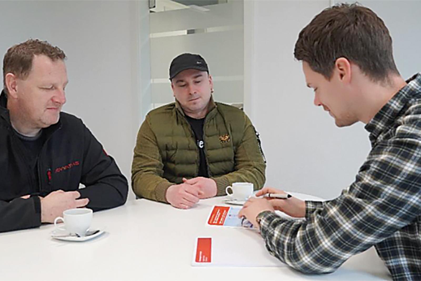 Bei der Bearbeitung der Unterlagen für die Umschulung (von links): Gerrit Twellaar und Gregor Cebula mit Niklas Plaisier von der Agentur für Arbeit.  © Foto: Scheljagin (Agentur für Arbeit)