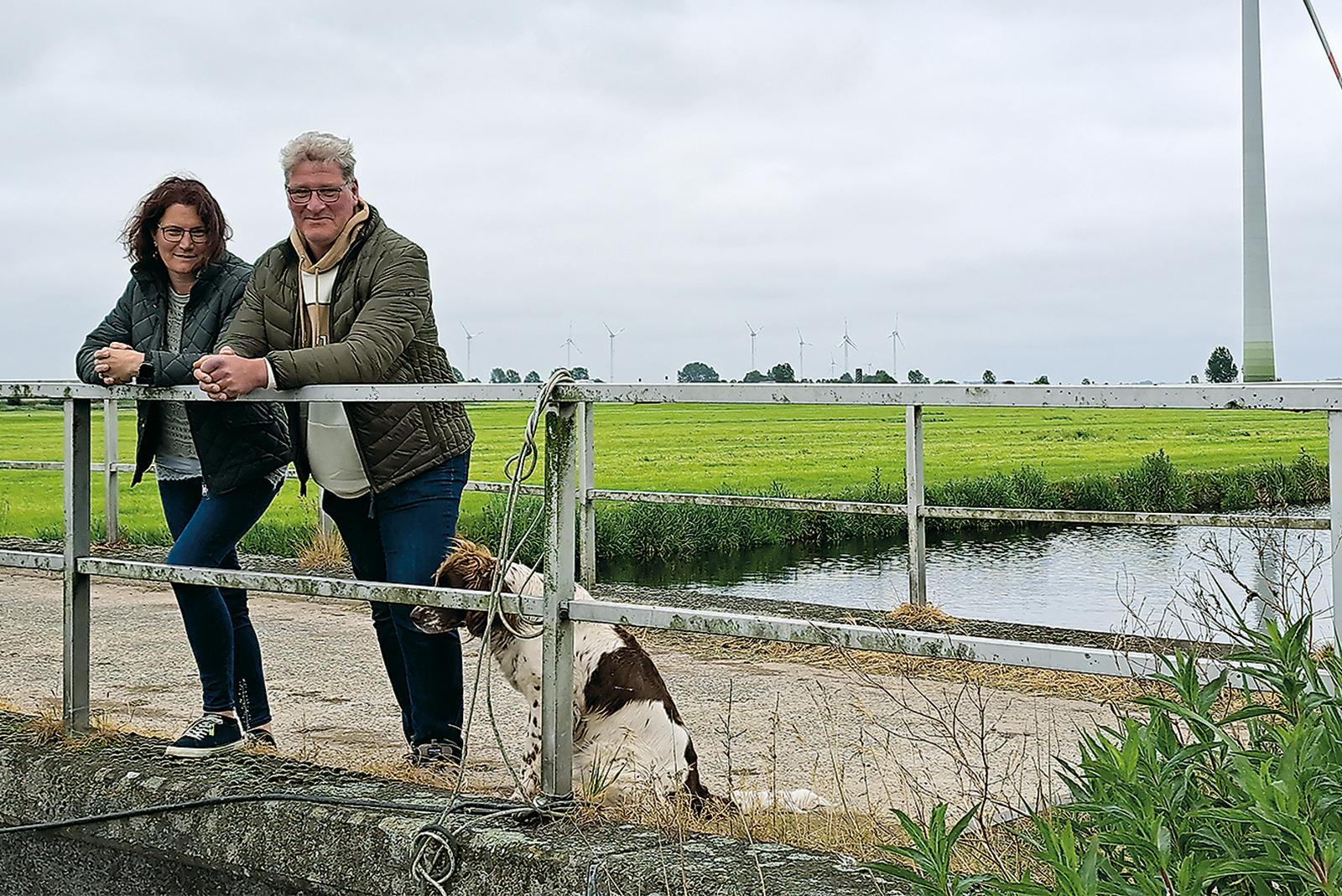 Zwischen dem Soltborger Sieltief und der Autobahn 31 wollen Maike und Enno Janssen - hier mit Hund »Lotta« - auf einer Gesamtfläche von rund 180.000 Quadratmetern den »Solarpark Holtgaste« betreiben.  © Foto: Szyska