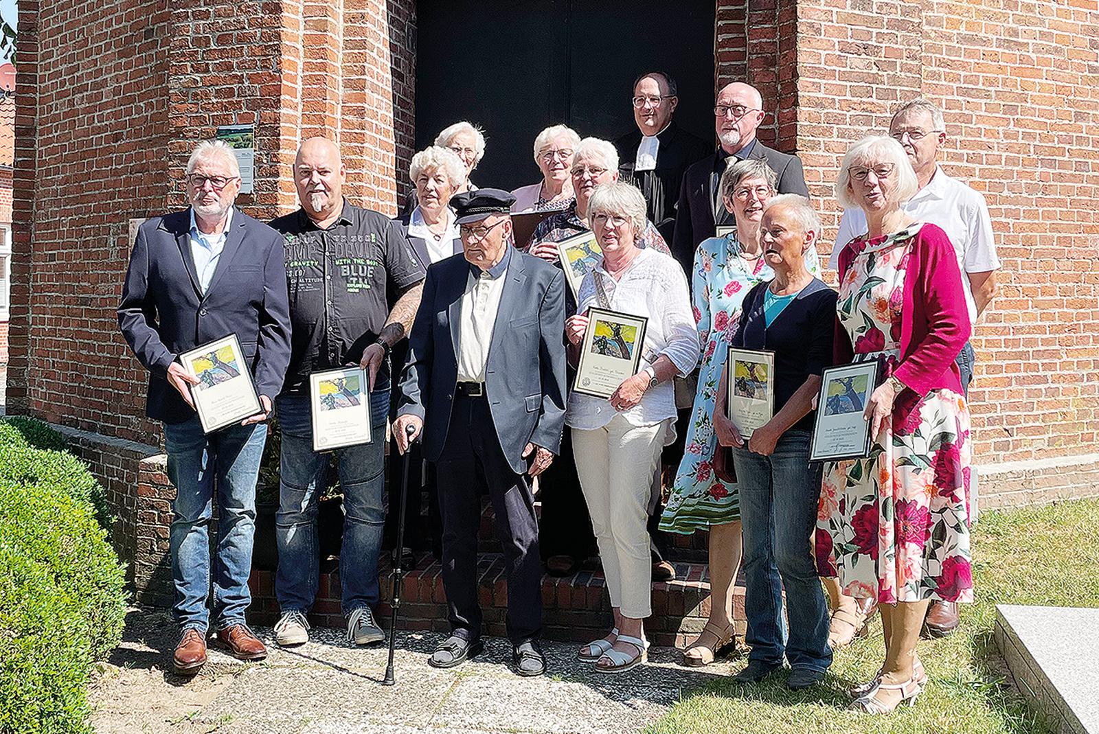 Die Jubilare: Hans-Rudolf Pruin, Werner Heijenga, Annette Halfwassen, Margarete Fresemann, Detmar Wilts, Magarete Hesse, Maike Troff, Viola Budde, Pastor Martin Schneider, Gerold Kruse, Frauke Franz-Holstein, Liny van Vlyten, Annette Grossterlinden undHermann de Vries.  © Foto: Wolters