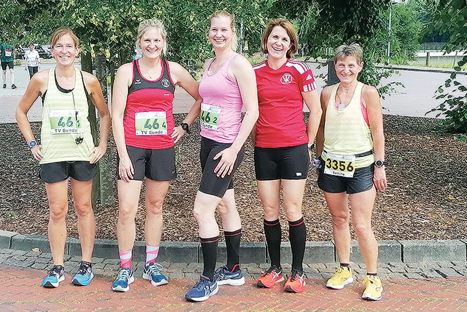 Insa Franzen (von links), Anneke Girod, Marie Troff, Frauke Buntjer und Bettina Pilney nahmen erfolgreich am Remmers-Hasetal-Marathon teil. © Foto: privat
