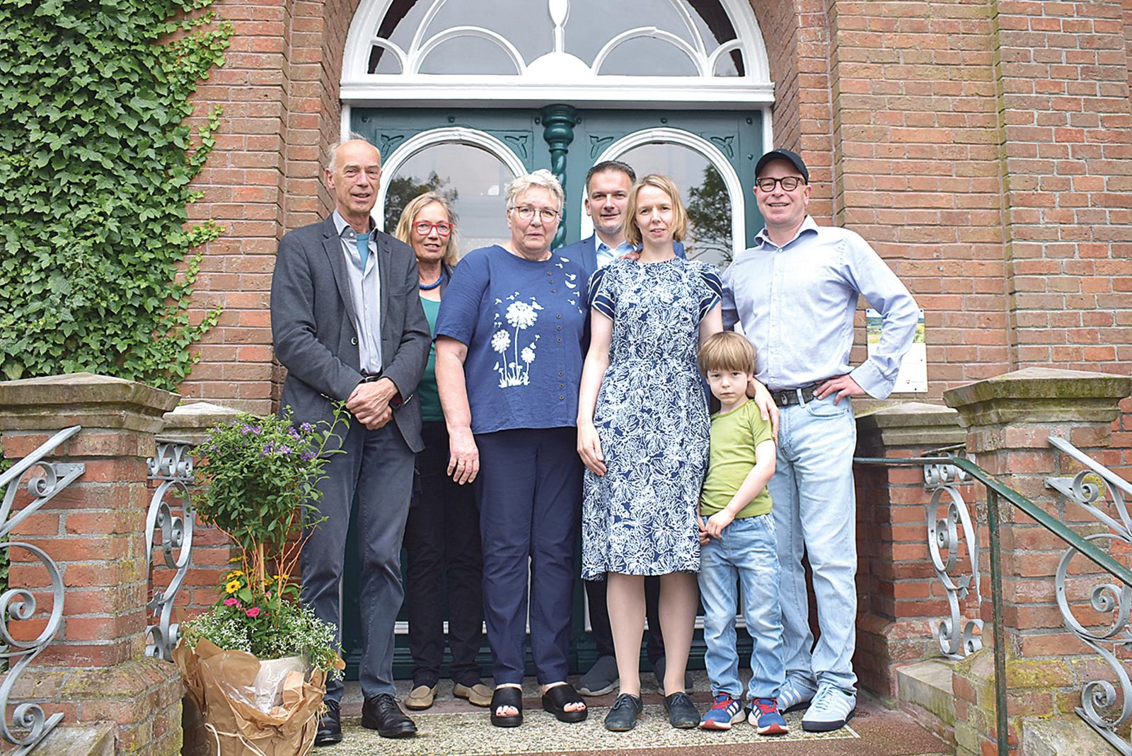 Janna Verch (Mitte links) und Tocher Anne (rechts daneben) freuen sich mit (von links) Hinrich Balsters, Anne Balsters-Pistorius, Bürgermeister Uwe Sap und Christian Köhntopp über die neue Bestimmung des Wohnhaus auf dem ehemaligen Balsters-Hof in Landschafspolder.  © Kuper