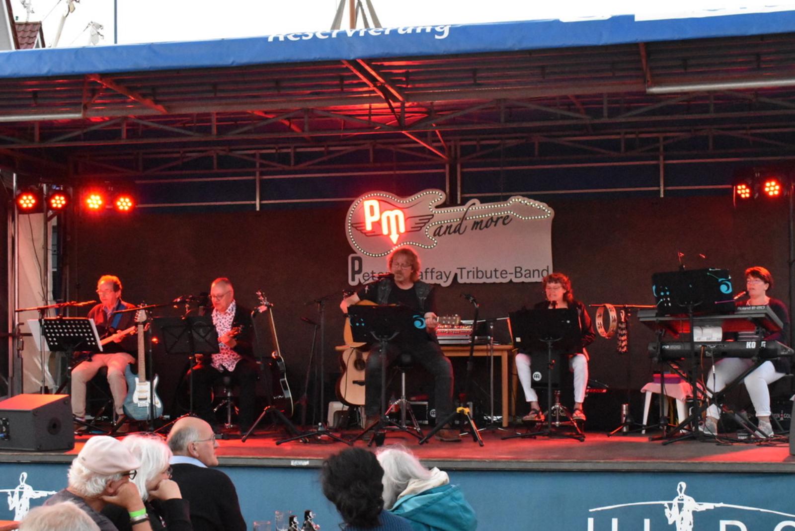 Die „Peter Maffay Tribute-Band“ aus Bunde sorgte neben dem Hafen mit niedrigem Wasserstand und Booten auf ...