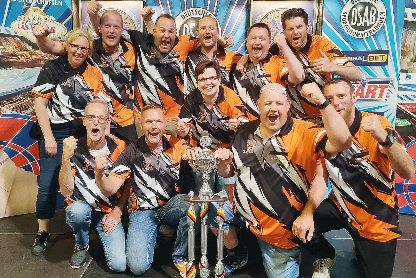 Markus Winzenborg (Dritter von oben links) aus Möhlenwarf und Benjamin Frei (Zweiter von oben rechts) aus Weener haben in der Bezirksligen-Klasse der Deutschen Liga-Mannschafts-Meisterschaften den Titel mit dem DC Snakes gefeiert.  © Foto: privat