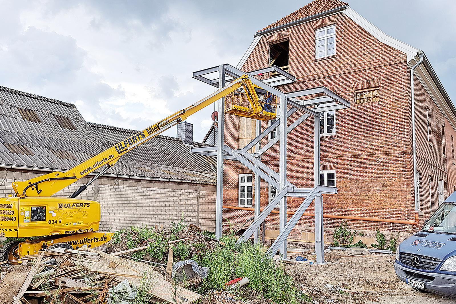 Die Metallbauer von Reiner Kaput aus Soltborg waren gestern mit der Installation der Fluchttreppe an der rückwärtigen Seite des Bürgerhauses beschäftigt.  © Foto: Szyska