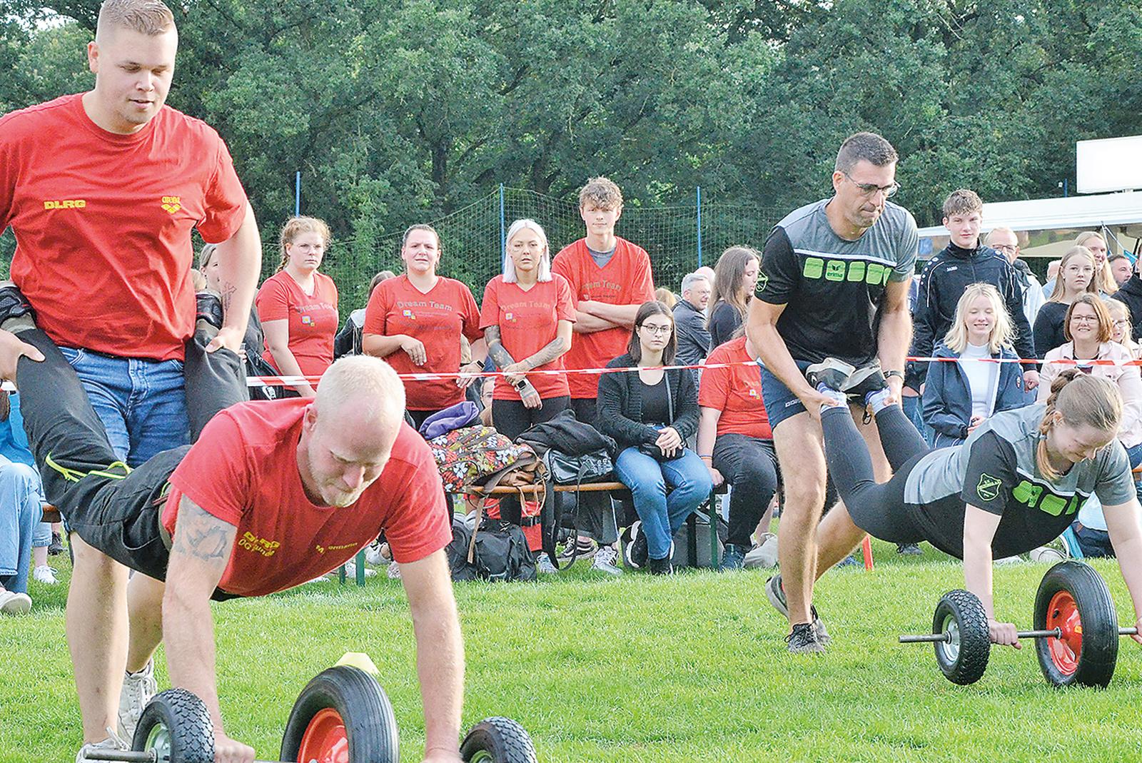 Kräftezehrend war das Spiel »Stange mit Rädern«. In dieser Szene duellieren sich die DLRG Bunde (links) und die Tischtennis-Abteilung des SV Teutonia Stapelmoor.  © Ammermann