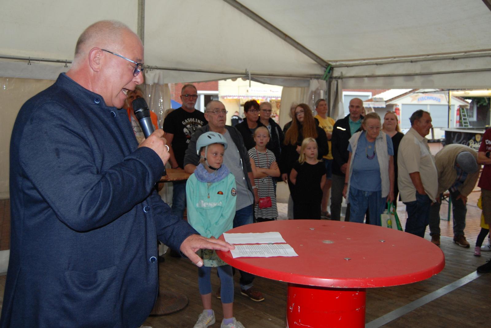 Bürgermeister Hans-Peter Heikens eröffnete heute Vormittag mit einer kurzen Ansprache den Müggenmarkt in Jemgum. Für die Kinder gab es anschließend Freifahrten in den Fahrgeschäften auf dem Marktgelände. © Hoegen