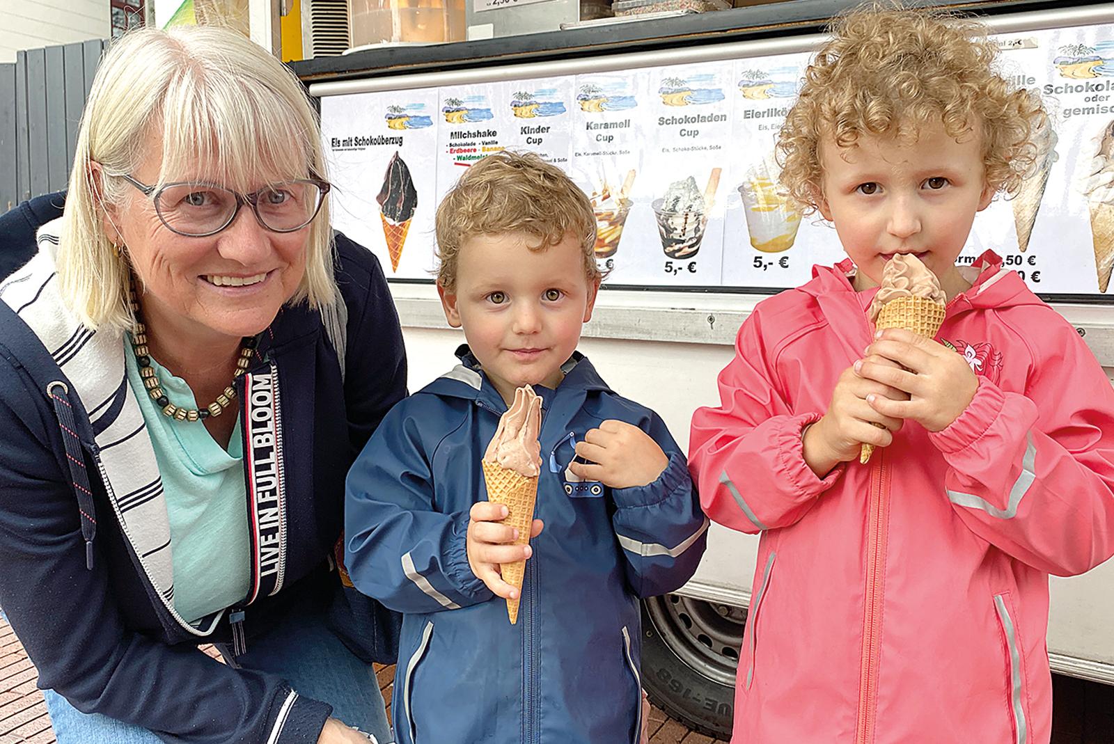 »Schokoladeneis ist am leckersten«, urteilten Emil und Karla aus Bad Nauenheim, die mit Gerlinde Kaput als »Oma Jemgum« den Müggenmarkt am Sonnabend nach dem Regen besuchten.  © Kuper