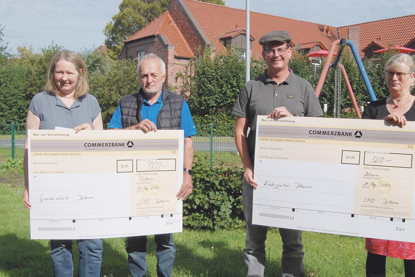 Torsten Dinkela als Vorsitzender des SPD-Ortsvereins Ditzum und Ortsvorsteher Konrad Kruse haben am Donnerstag insgesamt 720 Euro als Spende an den Förderverein der Grundschule Ditzum und an den Kindergarten Ditzum übergeben. Dieses Geld, die Summe wurde zwischen Förderverein und ...