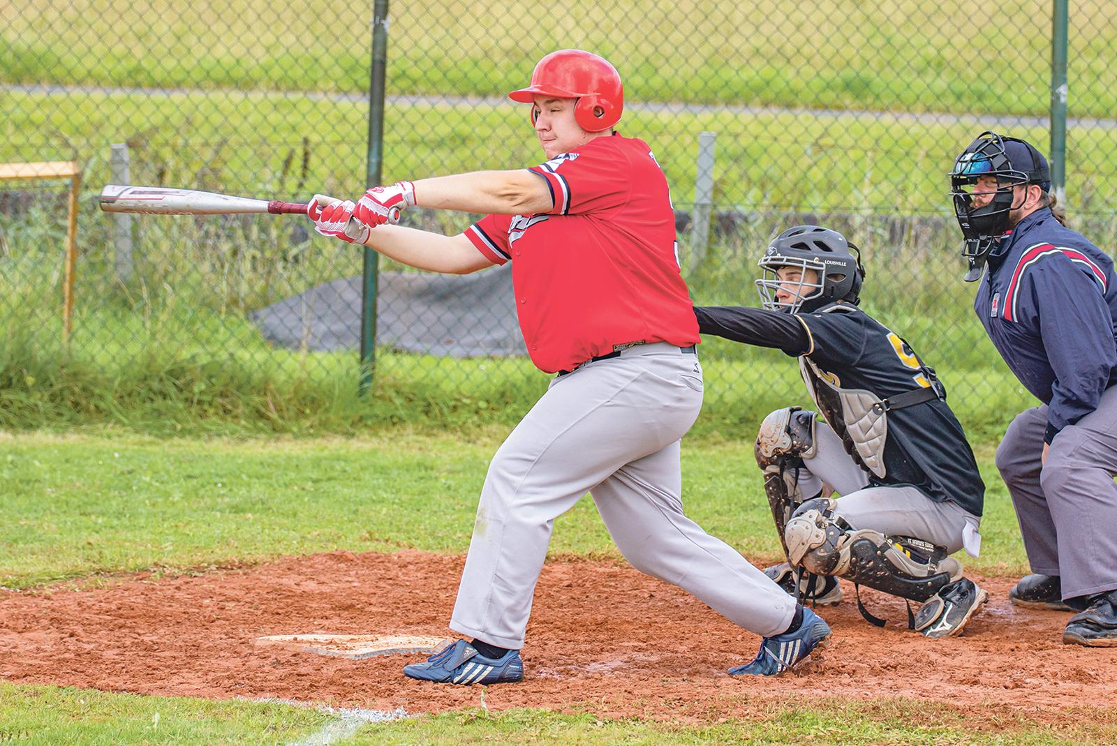 Jemgums Artem Zincenko trifft hier zwar den Ball, konnte aber im Anschluss keinen Run erzielen.  © Foto: Jungeblut