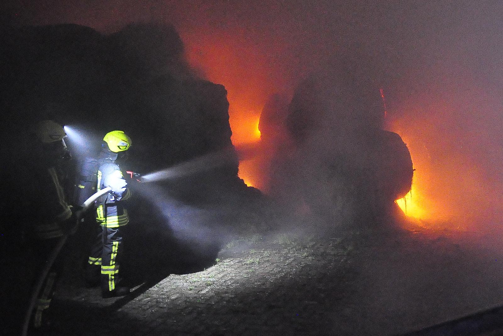 Zunächst konzentrierten sich die Feuerwehrkräfte darauf, dass das bestehende Feuer nicht noch auf weitere Rundballenvorräte übergreifen konnte. Auch der Logistikzug der Kreisfeuerwehr wurde alarmiert.