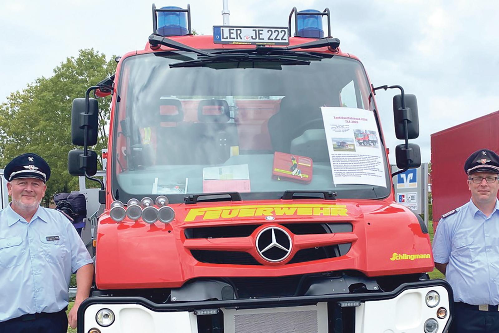 Ortsbrandmeister Ralph Janssen (links) und sein Stellvertreter Ralf Broß mit dem Tanklöschfahrzeug 2000. © Kuper