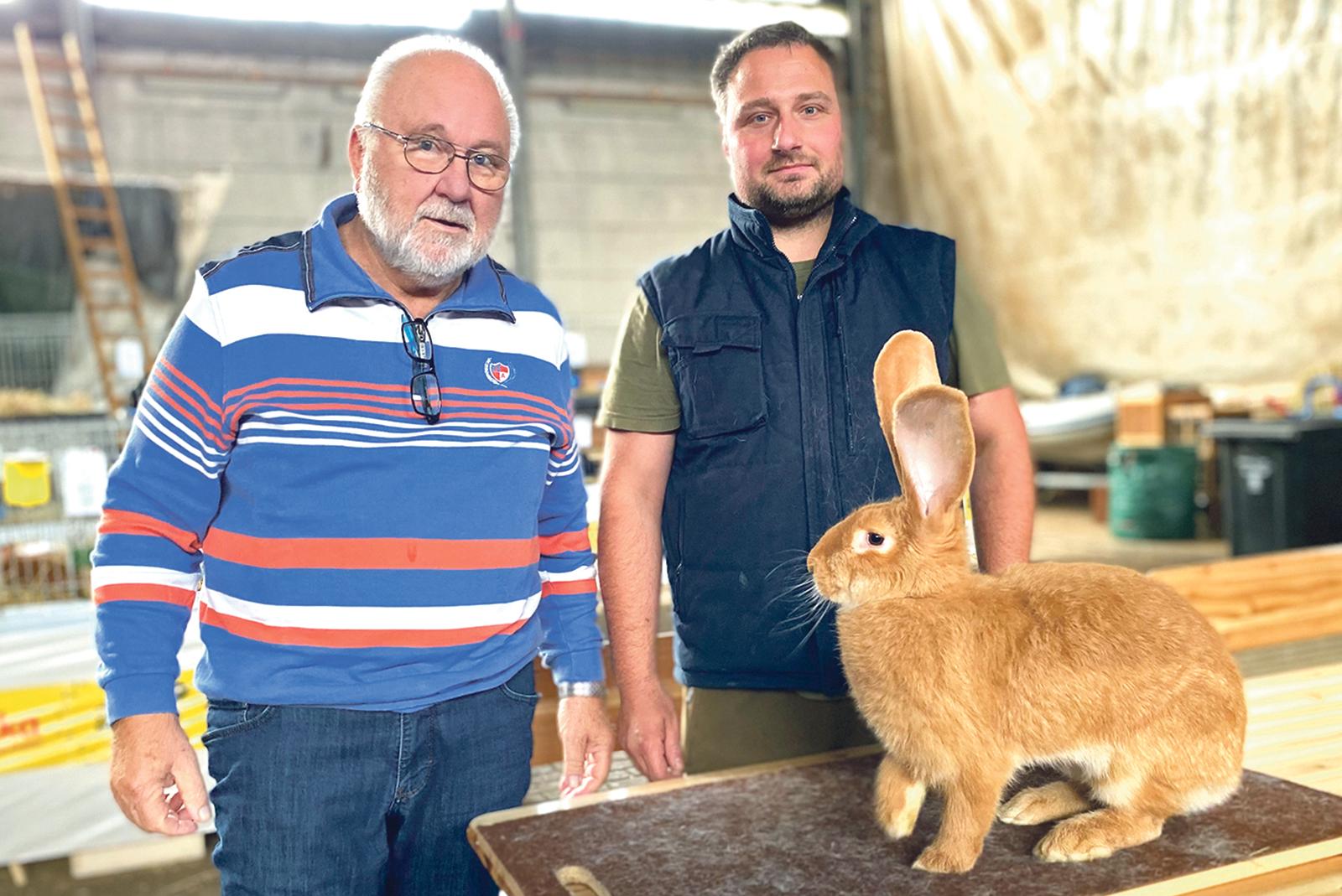 Manfred Eihusen (links), Vorsitzender des Kaninchenzuchtverein Leer, mit Gastgeber und Vereinsmitglied Andy Bültjer, der mit einem Exemplar seiner Rasse »Deutscher Riese gelb« auf der Werft in Ditzum zu Gast sein durfte. © Fotos: Kuper