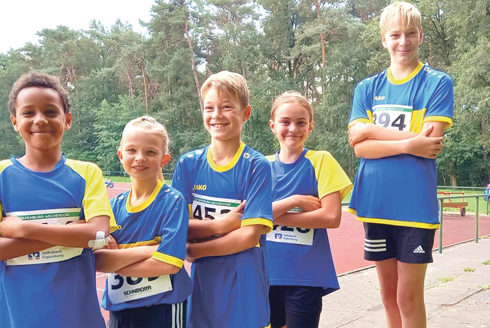 Malan Oltrop (von links), Lea Jansen, Rayk van der Slyk, Romi Bruhns und Raul Knoche nahmen in Papenburg am Nachwuchssportfest teil. © Foto: privat