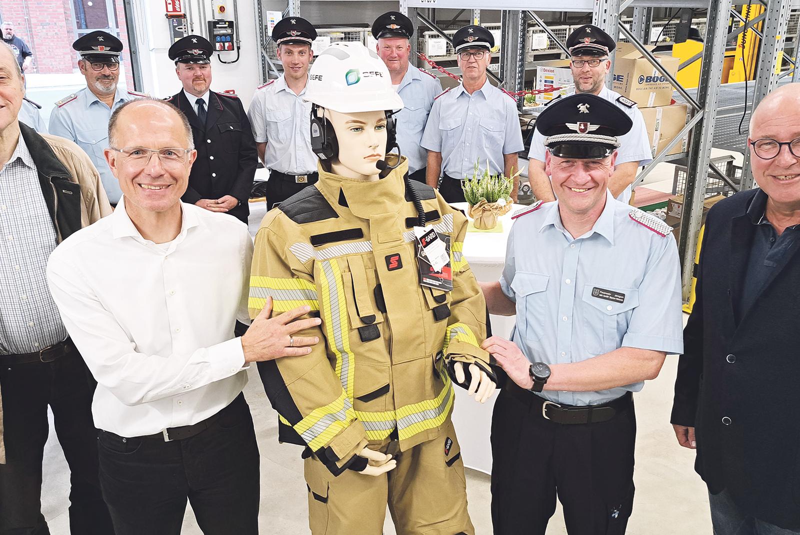 Nahmen eine Schaufensterpuppe in Schutzausrüstung in ihre Mitte (vorne von links): Albrecht Borchardt (EWE), Arkadius Binia (Astora), der stellvertretende Gemeindebrandmeister Stephan Hilbrands und Bürgermeister Hans-Peter Heikens. Auch die Ortsbrandmeister der vier Gemeinde-Wehren und ihre Stellvertreter (im Hintergrund) kamen zur feierlichen Übergabe.  © Foto: Szyska