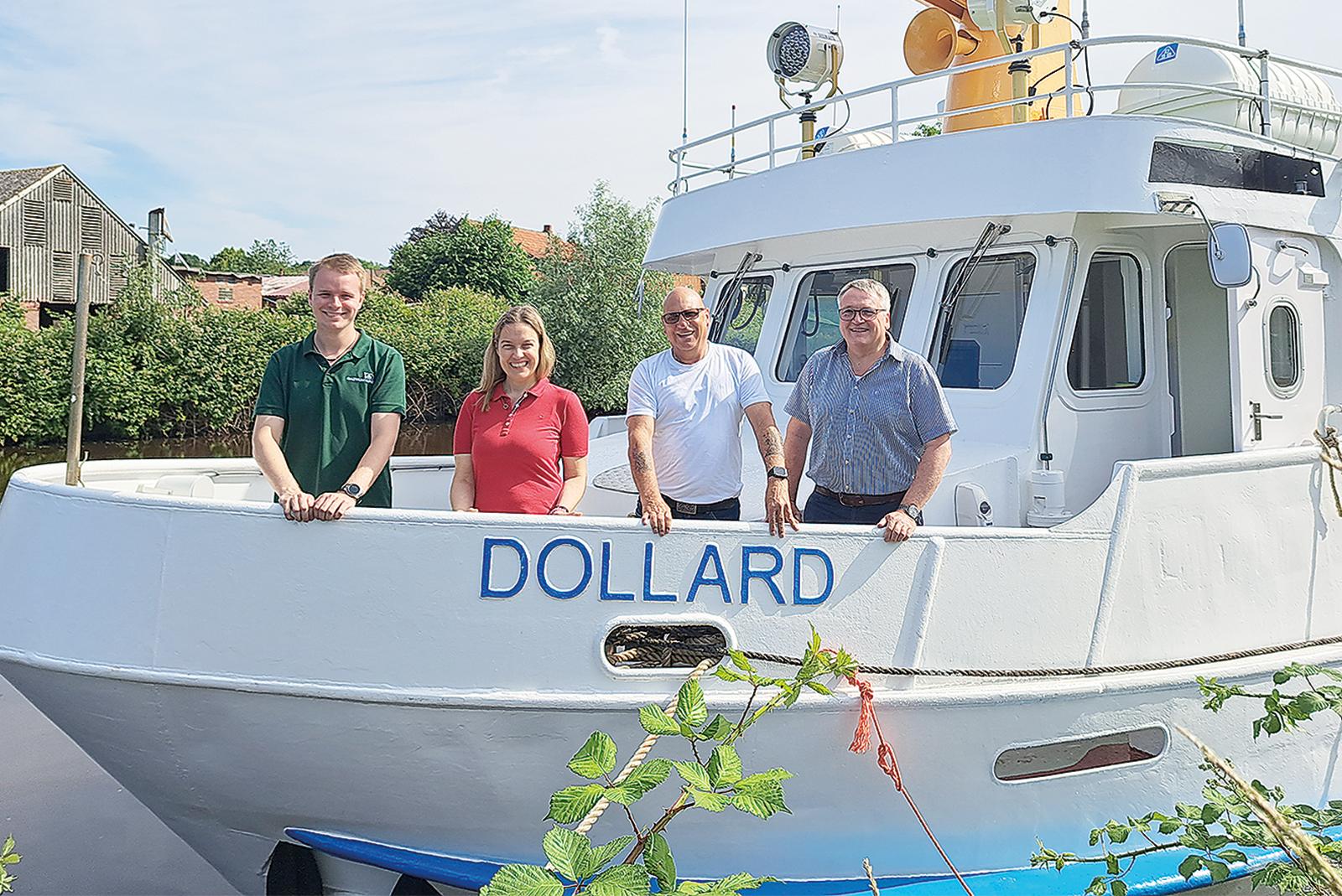 Bei einem Werftbesuch in Oldersum herrschte im Juni noch Zuversicht bei Sebastian Galts, Geschäftsführerin Christina Ulrichs und Decksmann Norbert Kaiser sowie Kurt Radtke vom Verein »Internationale Dollard Route« (von links). Doch ihre Hoffnung auf einen verspäteten Saisonstart wurde enttäuscht. Das Fahrgastschiff MS »Dollard« liegt noch immer auf der Werft.  © Foto: Szyska