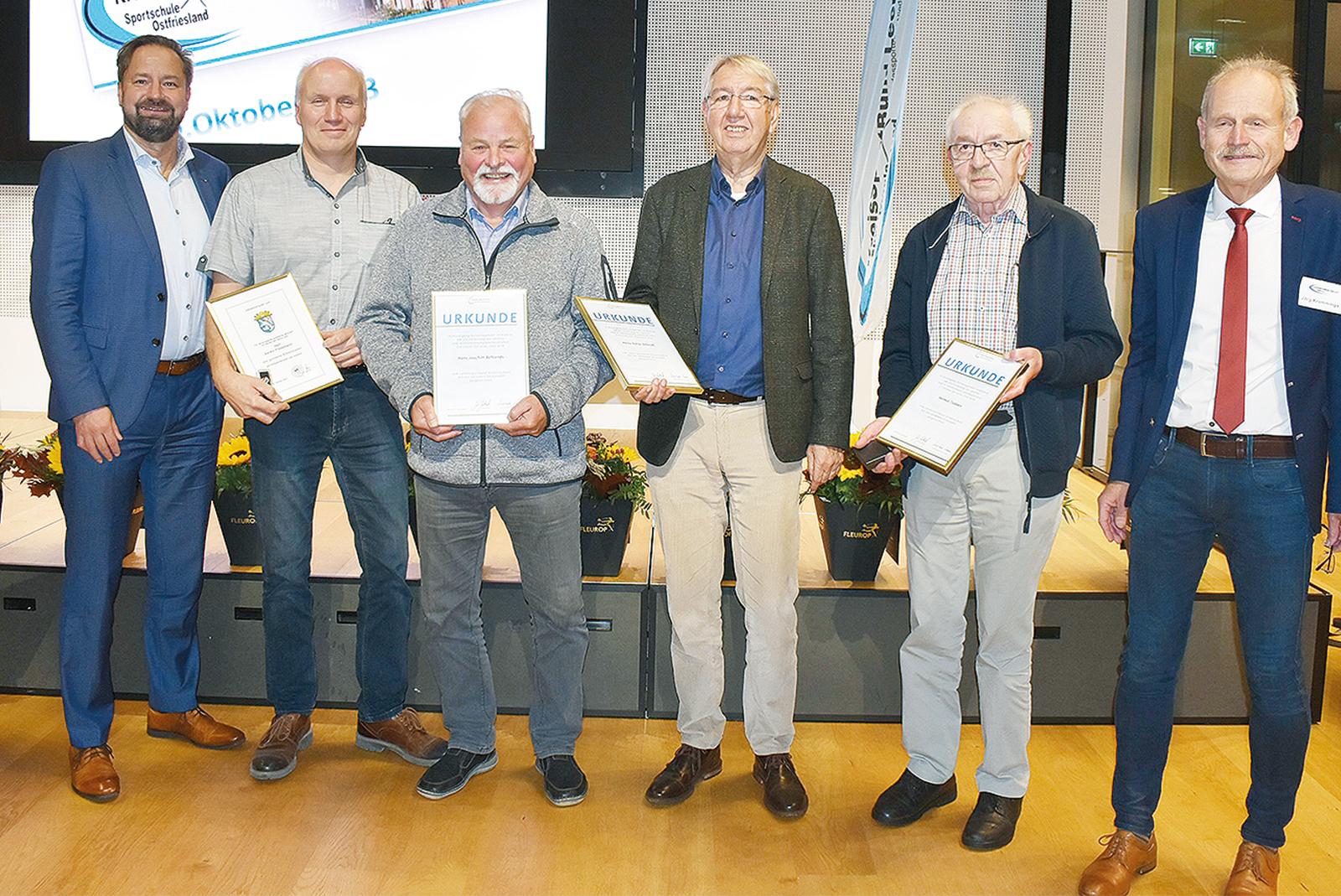 Vier der sechs Geehrten (mit Urkunde) kommen aus dem Rheiderland: (von links) Aeilko Fresemann (RuF Rheiderland), Hans-Joachim Behrends (SV Jemgum), Heinz Dieter Schmidt (BSV Bingum) und Helmut Tjabben (SV Wymeer-Boen) mit André Kwiatkowski (links) Jörg Kromminga (rechts).  © Foto: Kuper