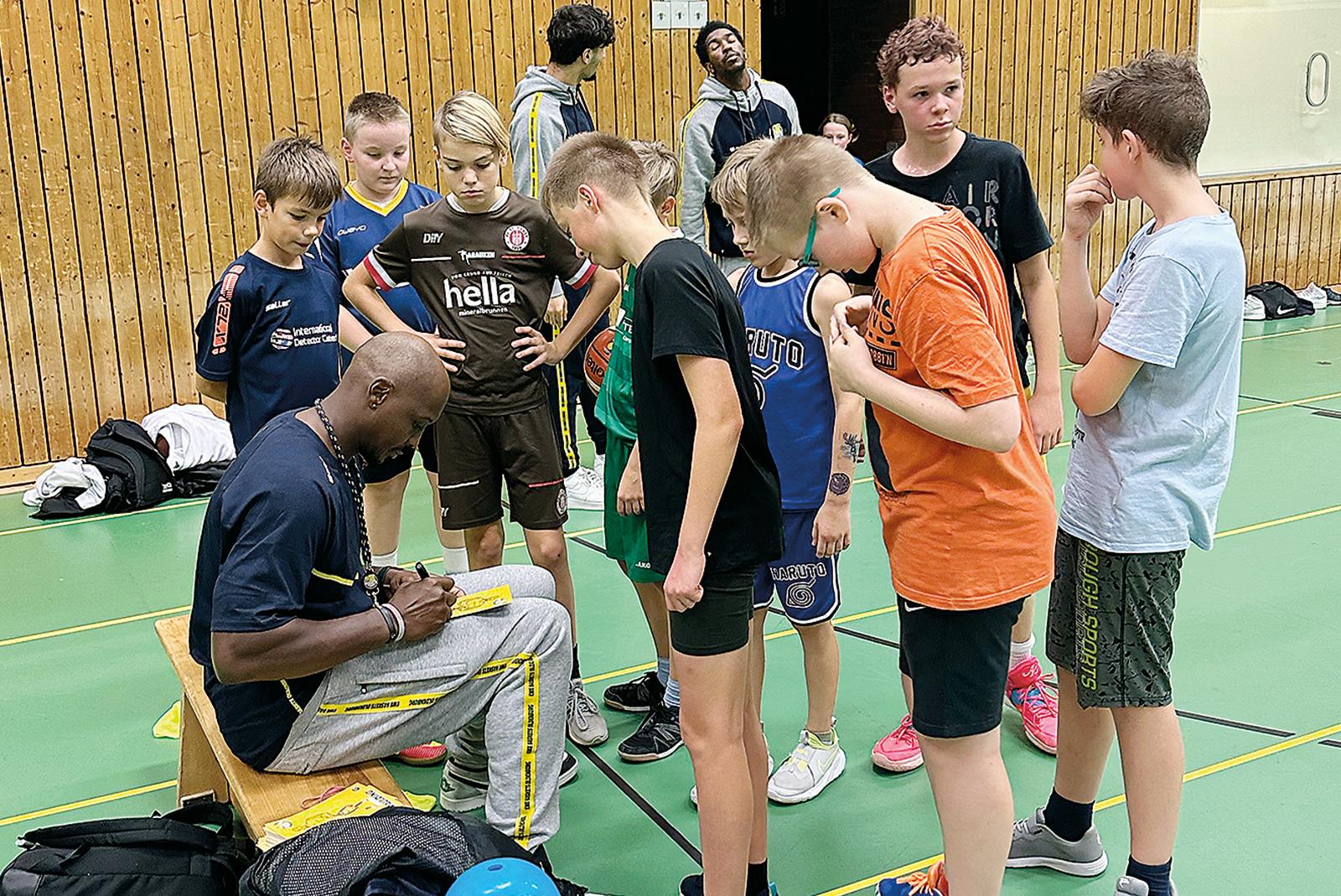 Jede Menge Autogrammwünsche junger Fans erfüllte Rickey Paulding (sitzend) in Leer. © Foto: Fortuna Logabirum