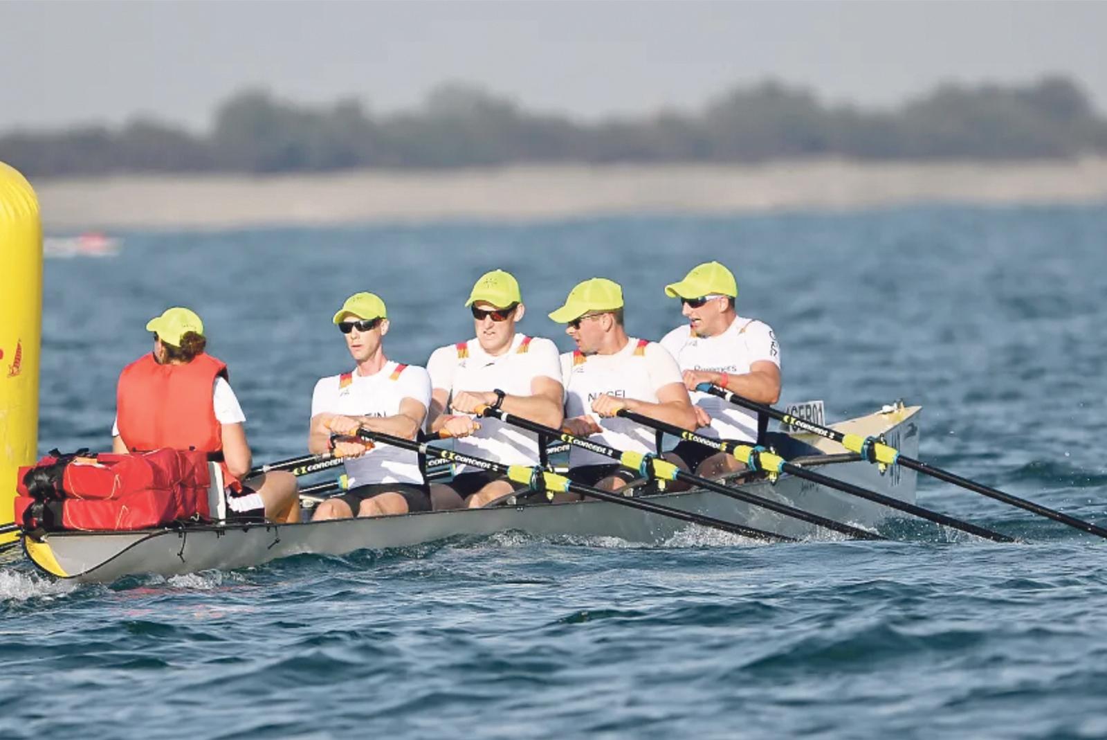 Steuerfrau Anja Nordmann (von links), Malte Hein, Christian Vennemann, Hendrik Nagel und der Auricher Maiko-Benedikt Remmers vertraten Deutschland bei der Weltmeisterschaft im »Coastal Rowing«.  © Foto: Detlev Seyb
