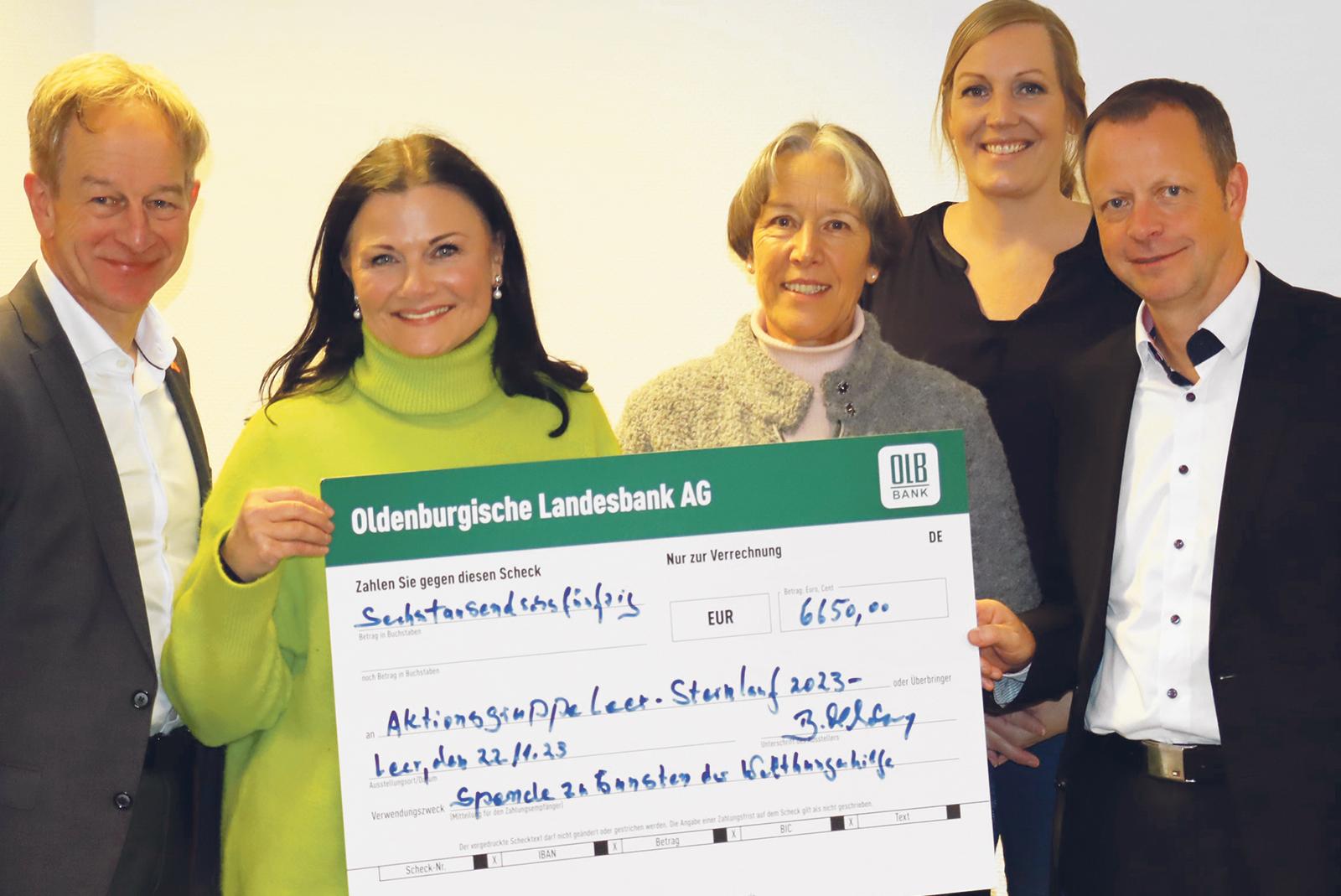 Andreas Meinders (von links, Orgadata AG), Schirmherrin Gitta Connemann (Bundestagsabgeordnete der CDU), Brigitte Oldenburg (Leeraner Welthungerhilfe), Vera Butterweck-Kruse (Rundholzlogistik-Lehe-Ems) und Marco Tuve (Oldenburgische Landesbank) trafen sich zur symbolischen Scheckübergabe in Leer.  © Foto: Ammermann